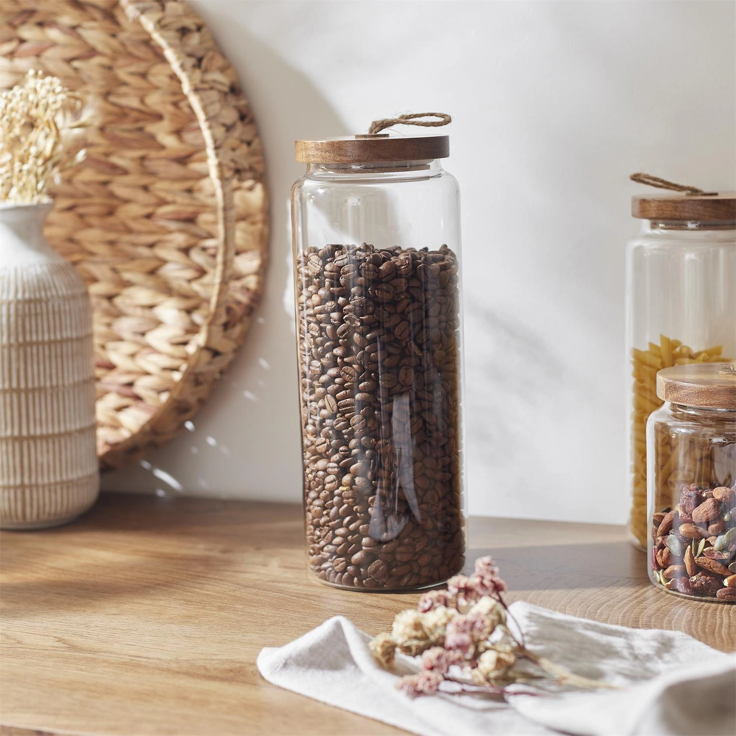 Elegancki słoik szklany z pokrywką z akacji o wysokości 27,5 cm to idealne rozwiązanie do przechowywania większych ilości artykułów spożywczych, takich jak przyprawy, herbaty czy sypkie produkty. Dzięki swojej pojemności i wysokiej jakości wykonaniu, słoik łączy funkcjonalność z estetyką, stanowiąc praktyczny i stylowy dodatek do każdej kuchni lub spiżarni.