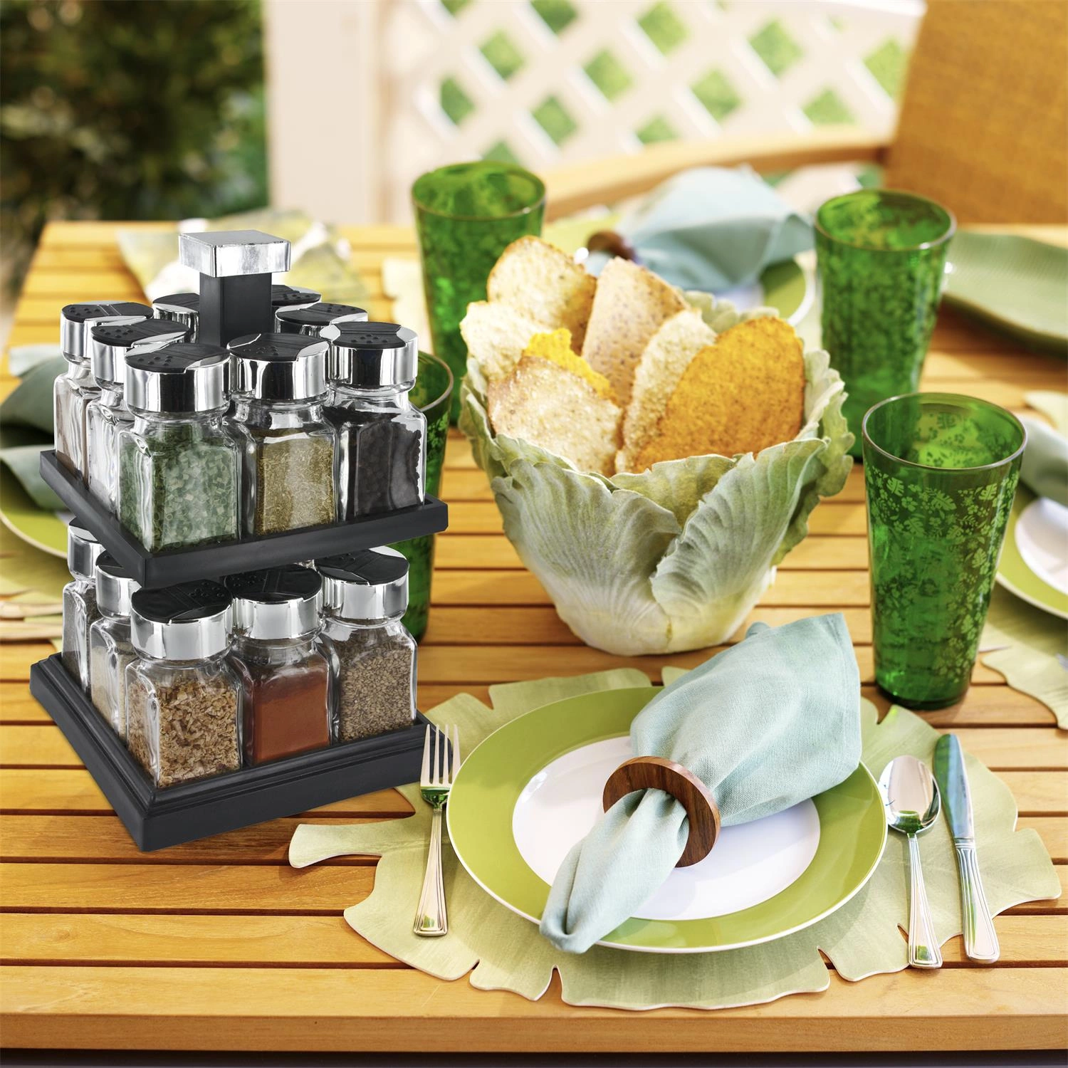 - 16 szklanych słoików: umożliwia przechowywanie wielu przypraw
