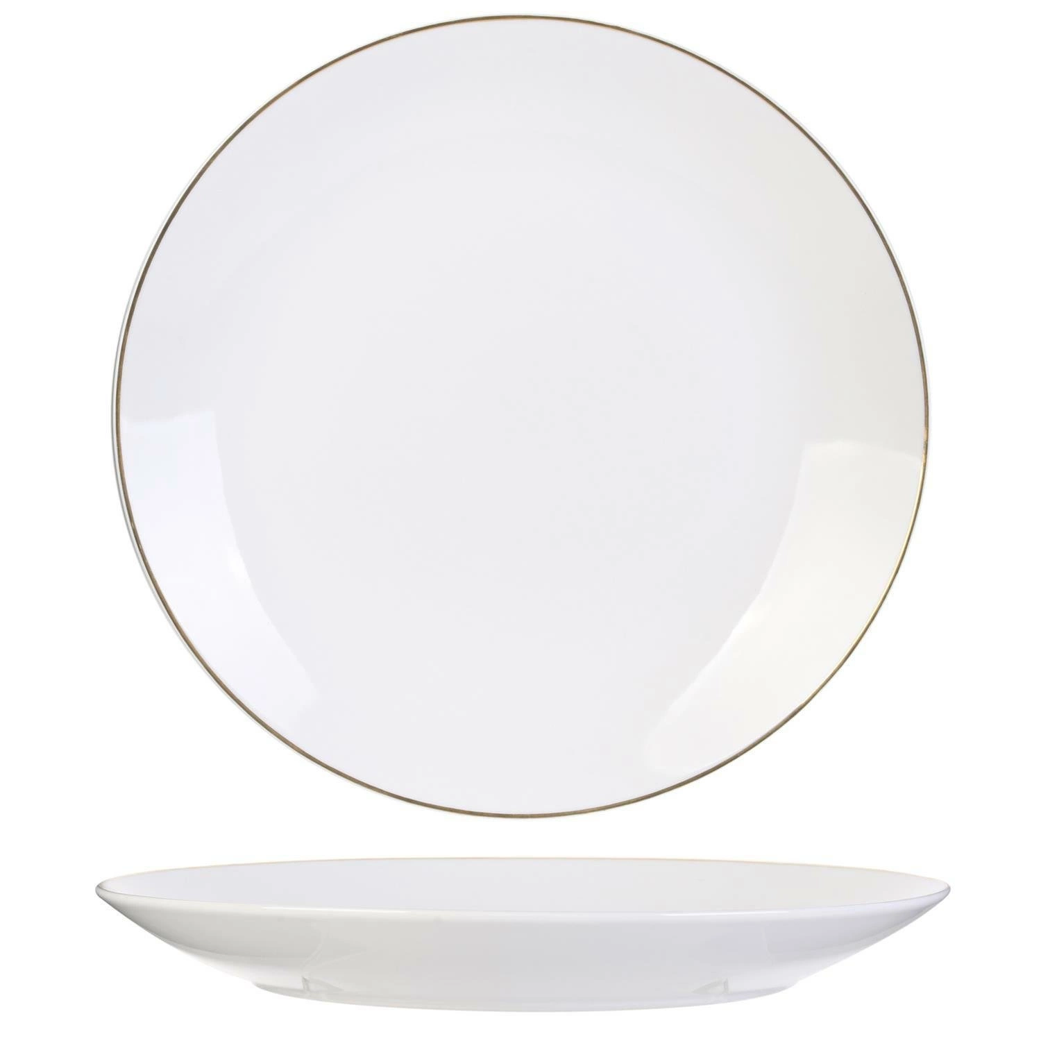 Talerz obiadowy Pearl Gold 27 cm marki Intesi to połączenie elegancji glamour z ponadczasową bielą ceramiki. Delikatna złota obwódka nadaje mu wyjątkowego charakteru, czyniąc z niego nie tylko praktyczny element zastawy, ale i subtelną dekorację stołu. Wykonany z wysokiej jakości ceramiki, zachwyca wyrafinowanym stylem i sprawdzi się zarówno w codziennej jadalni, jak i podczas wyjątkowych okazji.
