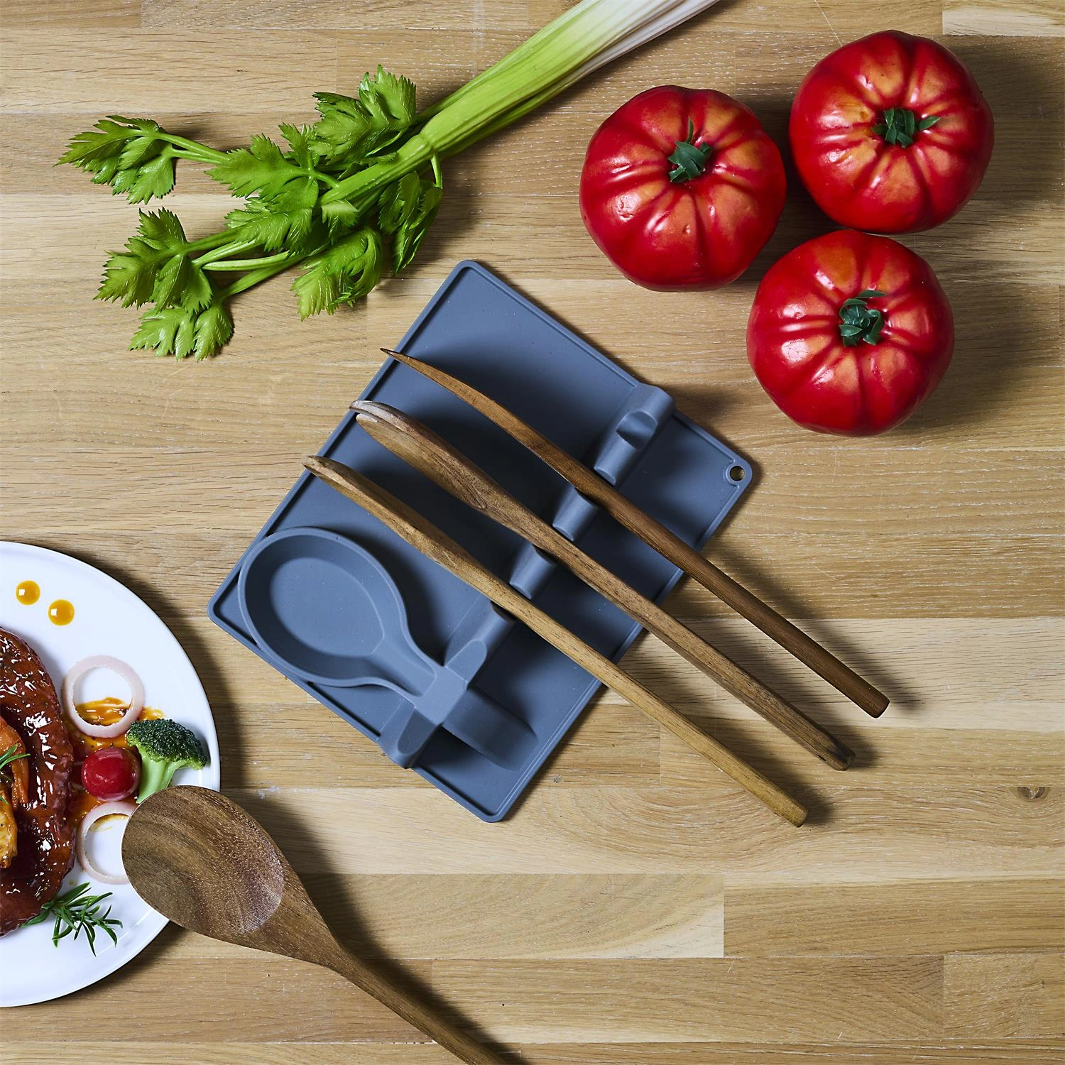Silikonowy uchwyt na przybory kuchenne pozwoli w czysty sposób na gotowanie i przygotowywanie posiłków. Uchwyt na który możemy odłożyć łyżkę, która mieszamy potrawę to must have każdej nowoczesnej kuchni. Na uchwycie możemy odłożyć bambucowe szpatułki, łyżki lub widelce. Uchwyt łatwy w czyszczeniu i odporny na wysoką teperaturę. Dzięki temu ochroni nasz blat przed niepotrzebnymi plamami lub odbarwieniami. Ychwyt w szczególności dedykowany jest dla blatów kamiennych oraz ze spieków które są wyjątkowo podatne na plamy i trwałe zabrudzenia.