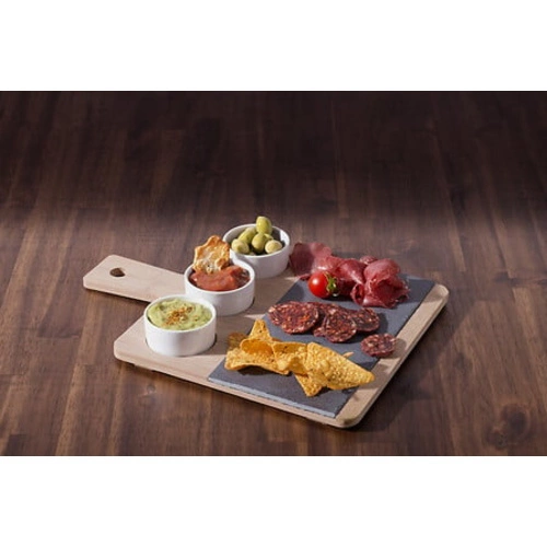 Design zestawu do przekąsek z łupka i bambusa jest bardzo nowoczesny, co sprawia, że będzie idealnie pasował do każdej, nawet najbardziej minimalistycznej kuchni. Czarny kolor łupka i porcelany doskonale kontrastuje z naturalnym kolorem bambusa, tworząc unikalną i elegancką kompozycję. Zestaw będzie doskonałym uzupełnieniem wyposażenia każdej kuchni i z pewnością podkreśli jej charakter.