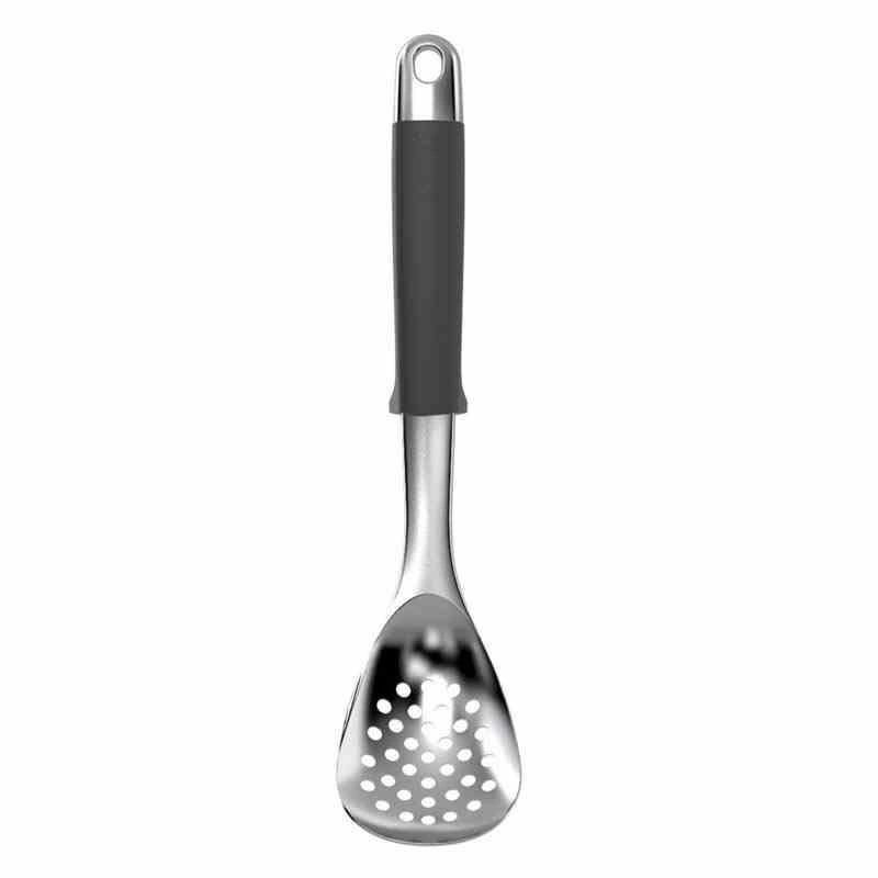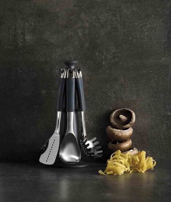 - w komplecie: chochelka, łyżka cedzakowa, łyżka kuchenna, łyżka do spaghetti, łopatka z otworami, łyżka z otworami oraz obrotowy stojak z antypoślizgową podstawą,