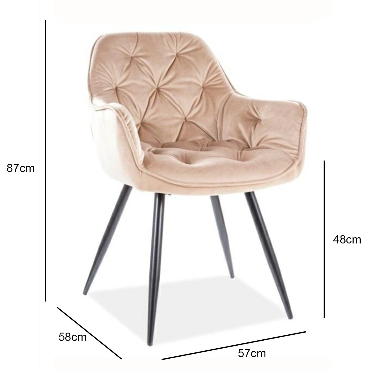 Krzesło z podłokietnikami, pikowanym siedziskiem i oparciem oraz czarnymi nogami sprawdzi się we wnętrzu nie tylko glamour. Nowoczesny salon lub jadalnia to idealne miejsce na pikowane, aksamitne krzesło tapicerowane. Miękkie, pikowane siedzisko jest wygodne do siedzenia, a cztery czarne malowane proszkowo nogi zapewniają niesamowitą stabilność.