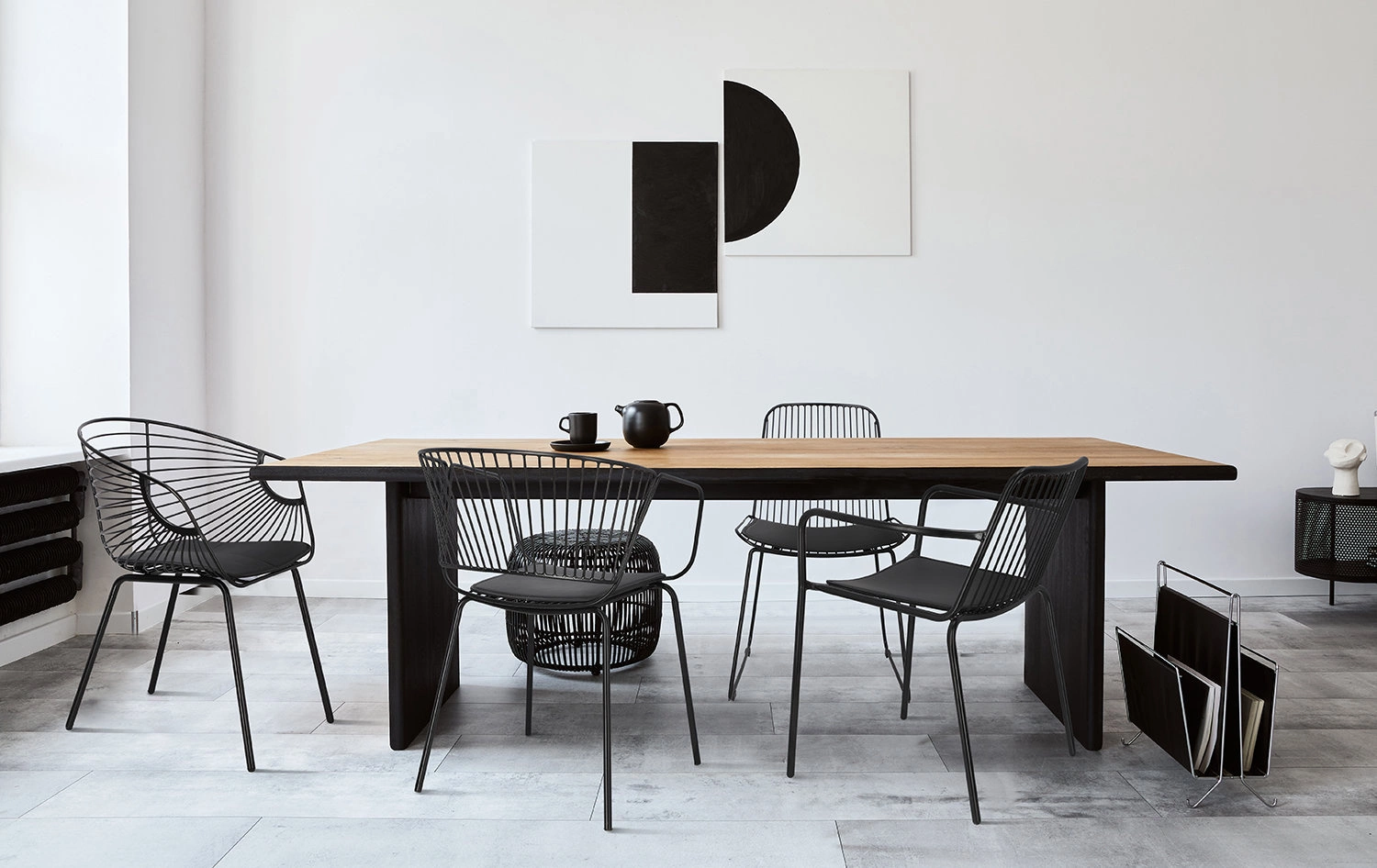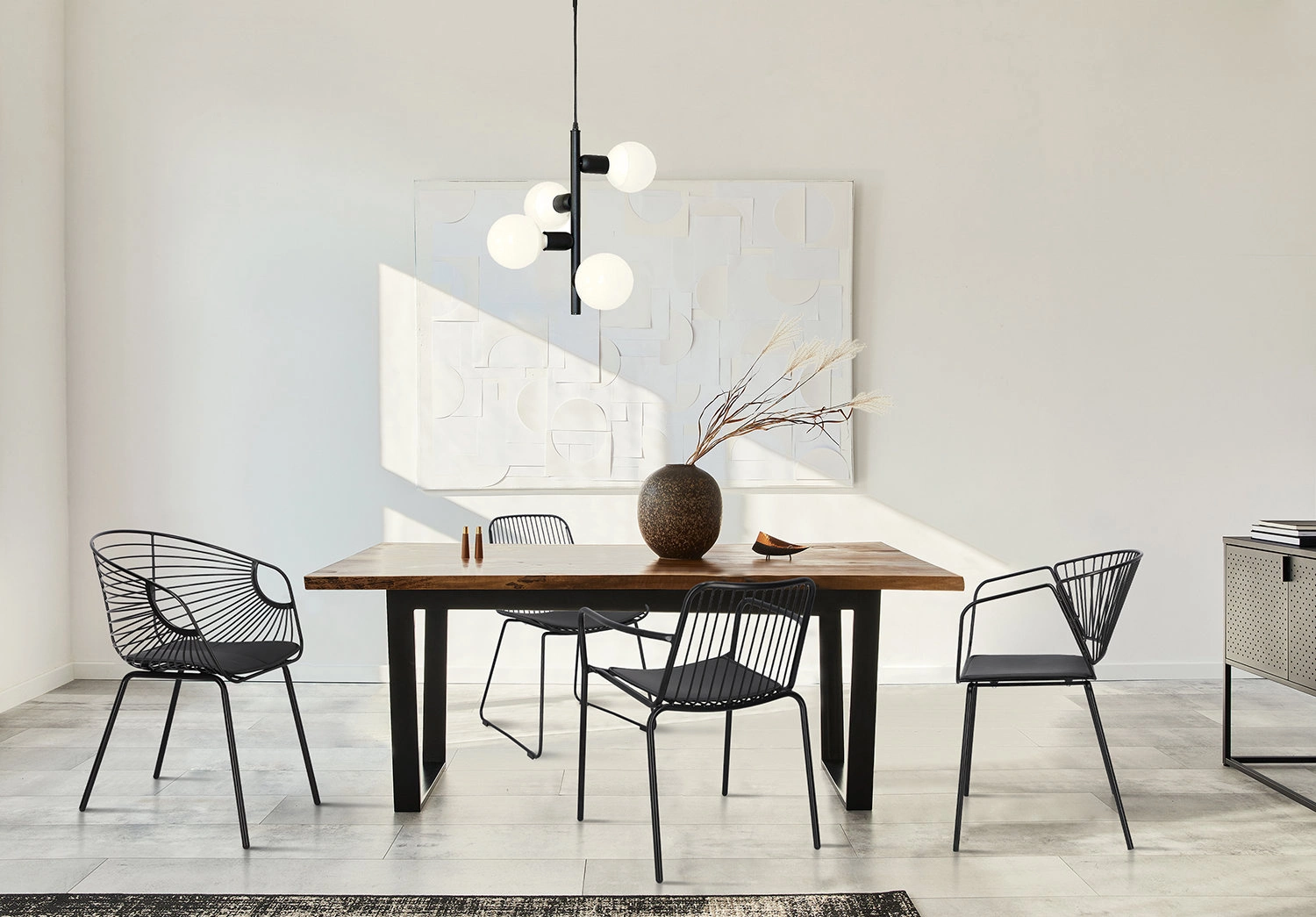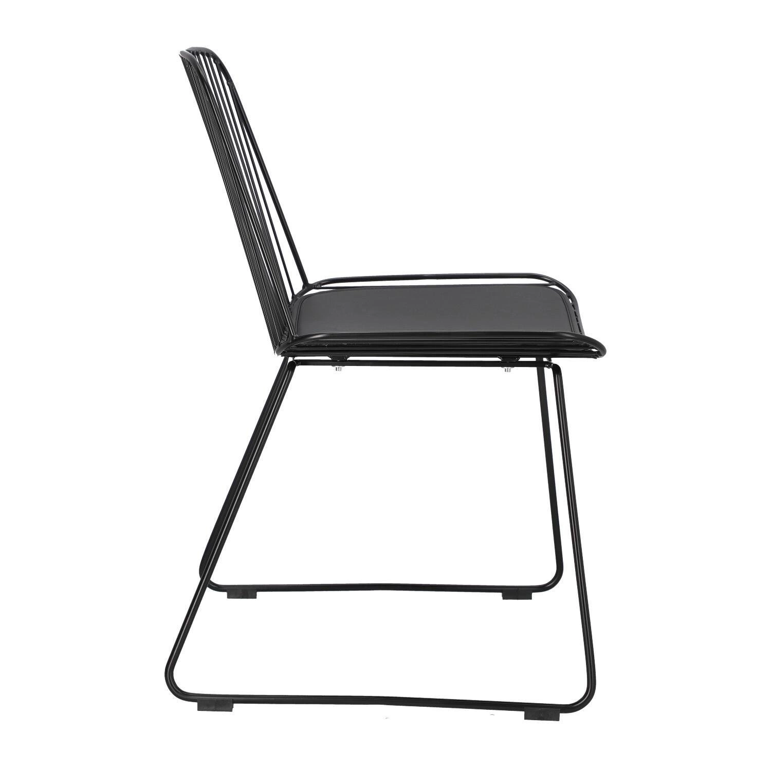 Krzesło Dill to designerska propozycja dla osób ceniących niezależne wyjątkowe projekty. Czarne loftowe krzesło ze zdejmowaną poduszką z eko skóry to odważny model, który zachwyca swoją oryginalnością. Ażurowe krzesło sprawdzi się jako krzesło do jadalni, kuchni i salonu. Ciekawym pomysłem będzie na przykład wykorzystanie kilku krzeseł połączonych z innymi siedziskami. Dill będzie prezentować się bardzo dobrze zarówno w komplecie, jak i pojedynczo. Zachwycające w swojej prostocie krzesło będzie nie tylko wygodnym siedziskiem, ale również ozdobą. Krzesło o siedzisku oraz oparciu wykonanym z wielu cienkich przęseł będzie nietypowym elementem każdego wnętrza. Podstawa krzesła to płozy zabezpieczone nakładkami z tworzywa, które zapobiegają rysowaniu się podłoża. Konstrukcja z metalu pomalowanego proszkowo na czarno utrzymana została w półmatowym wykończeniu.