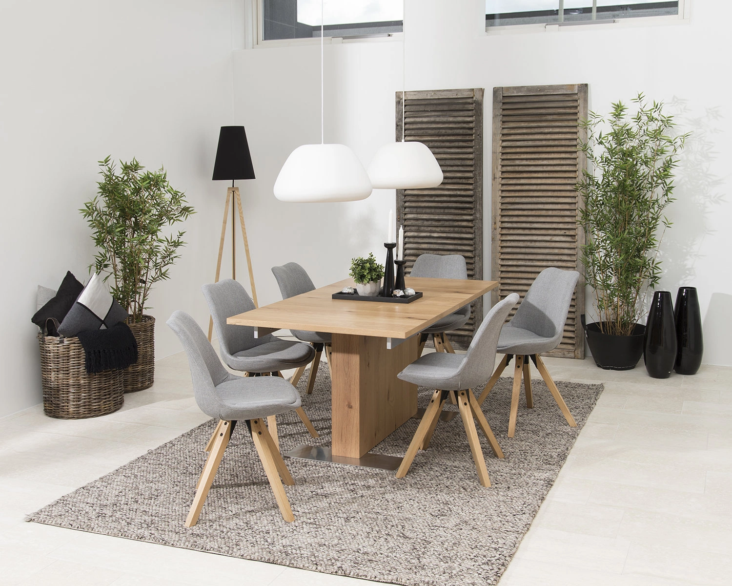 Podstawa krzesła Dima wykonana została natomiast z olejowanego drewna kauczukowego. Jego powierzchnia pokryta jest bejcą w kolorze dębu, co podkreśla naturalny wygląd drewna, a jednocześnie zabezpiecza podstawę przed zniszczeniami. Cztery grube drewniane nogi ustawione pod kątem zapewniają bezpieczeństwo i stabilność. Krzesło wymaga montażu podstawy do siedziska za pomocą śrub.