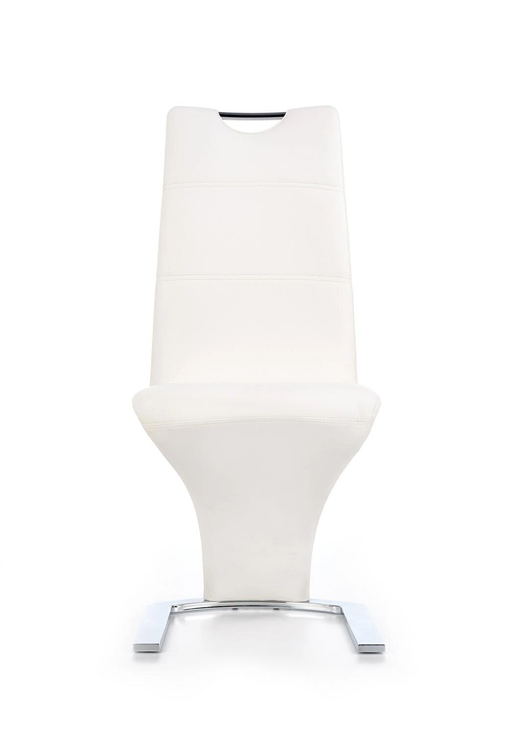 Wysokie oparcie oraz odpowiednio wyprofilowane siedzisko zapewniają komfort nawet podczas długich spotkań przy stole. Stabilne płozy gwarantują solidne podparcie i delikatnie sprężystą pracę, co podnosi wygodę użytkowania. Mimo braku podłokietników, krzesło zachowuje ergonomiczny charakter i pozwala swobodnie wsunąć je pod blat stołu, oszczędzając miejsce w jadalni lub kuchni.