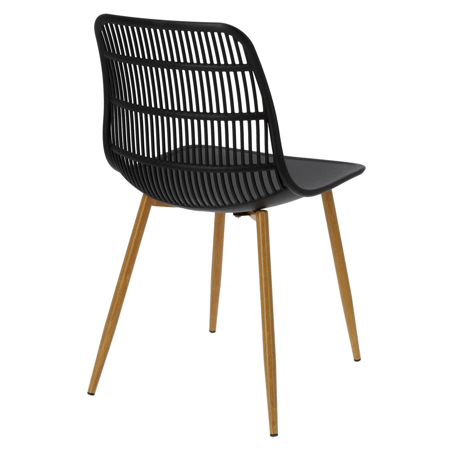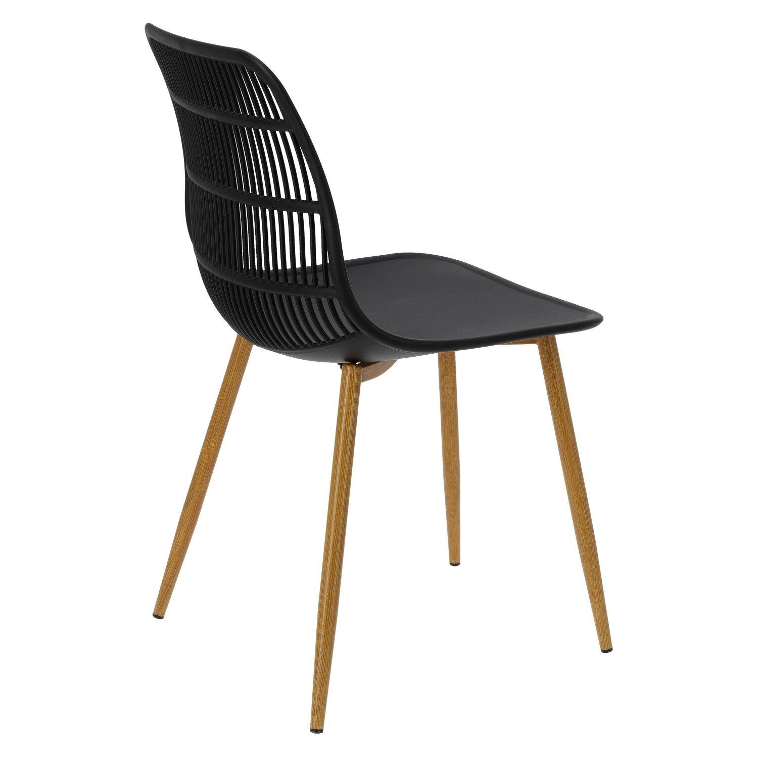 KRZESŁO KLAUS wyróżnia modna i nowoczesna forma, która spotyka się z uniwersalną funkcją. Siedzisko krzesła, wykonane zostało z wysokiej jakości polipropylenu w odcieniu klasycznej czerni, dzięki czemu jest ono wyjątkowo łatwe w pielęgnacji i utrzymaniu w czystości. Oparcie posiada liczne charakterystyczne otwory, które spełniają rolę dekoracyjną, a tym samym zapewniają wentylację podczas użytkowania. Dzięki zastosowaniu ergonomicznego profilowania siedziska krzesło zapewnia wysoki poziom komfortu i wygody. Podstawę natomiast stanowią 4 metalowe, smukłe nogi w okleinie imitującej drewno. Dodatkowo zakończone zostały one podkładkami w kolorze czarnym, dzięki czemu całość jest stabilna i nie przesuwa się w czasie siedzenia. Minimalistyczny design, nawiązuje do stylu skandynawskiego, jednak krzesło Klaus będzie równie dobrze wyglądać w aranżacjach nowoczesnych i industrialnych. Dzięki swojej uniwersalności sprawdzi się nie tylko w domowej kuchni czy jadalni, ale także w przestrzeniach takich jak sale konferencyjne czy poczekalnie.