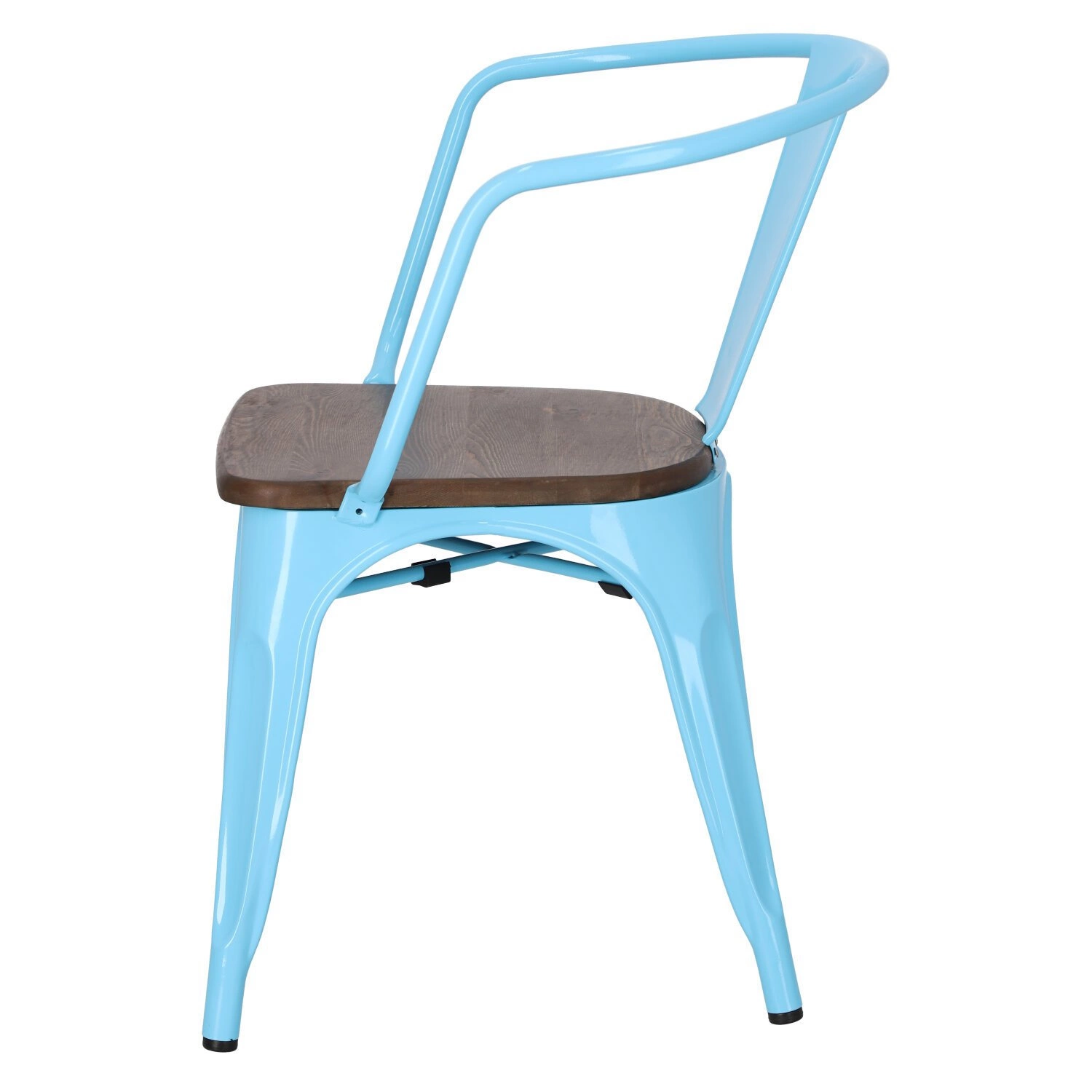 Metalowa konstrukcja, została podkreślona widocznymi elementami spawania, które od razu przynoszą na myśl dźwięki, wydobywające się z hut i starych fabryk. Nogi mebla zostały dodatkowo zabezpieczone gumowymi nakładkami, dzięki czemu pozostaje on stabilny i nie niszczy podłogi podczas przesuwania. Surowy charakter krzesła przełamuje starannie wykonane lakierowane siedzisko z drewna sosnowego w wybarwieniu orzechowym. Jest ono dzięki temu gładkie i łatwe do utrzymania w czystości. Oparcie krzesła posiada charakterystyczny, niepełny kształt podtrzymywany przez cienką, metalową rurkę. Taka rama dodaje z pewnością lekkości, na pozór ciężkiemu industrialnemu meblowi. Krzesło Paris Arms Wood wykonane jest z trwałych materiałów, odpornych na uszkodzenia oraz jest dostępne w kilku atrakcyjnych kolorach, które poszerzają możliwości aranżacyjne, gdyż można je ze sobą dowolnie łączyć i tworzyć niepowtarzalne, przyciągające uwagę kombinacje.