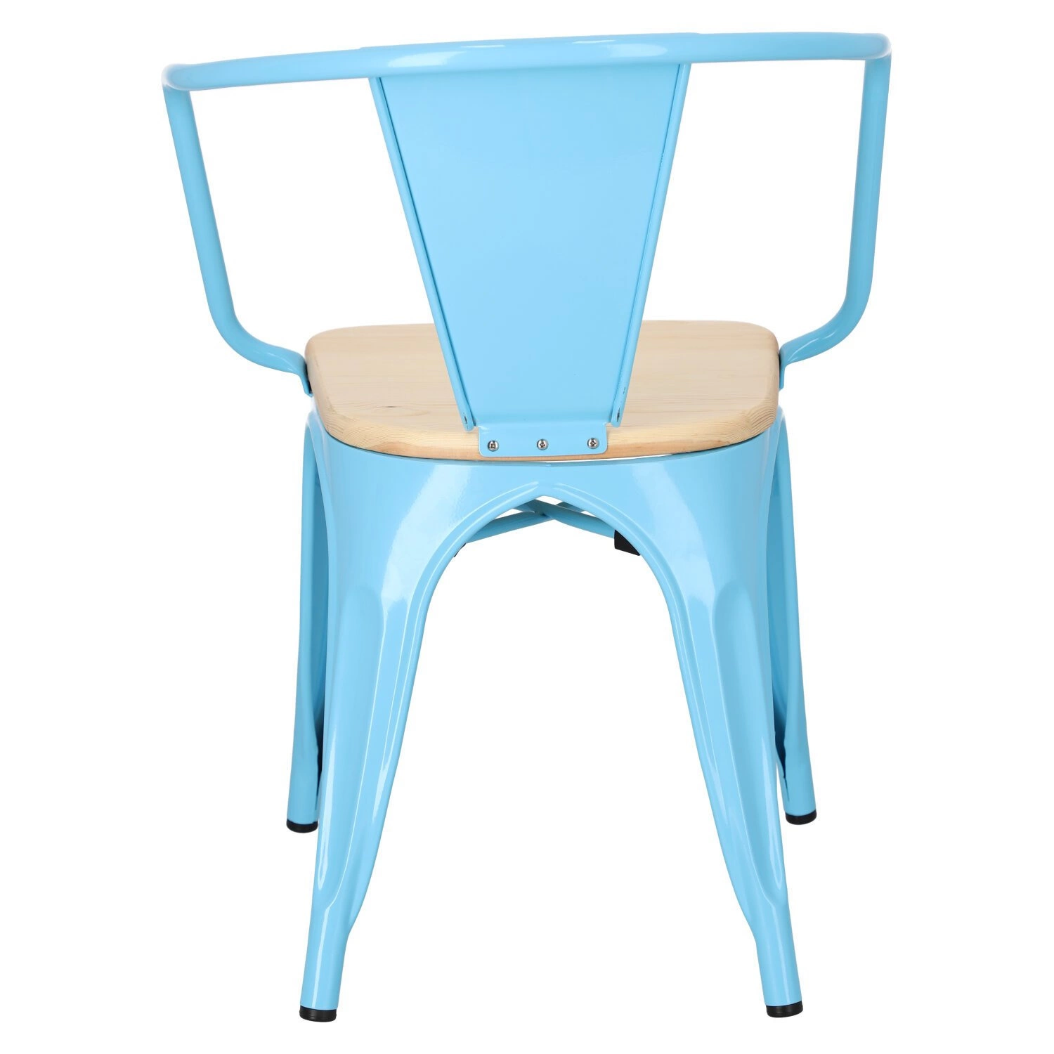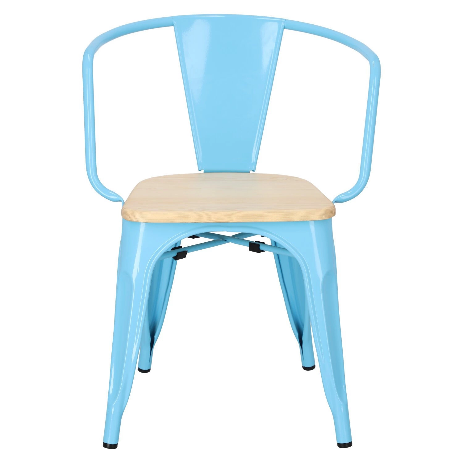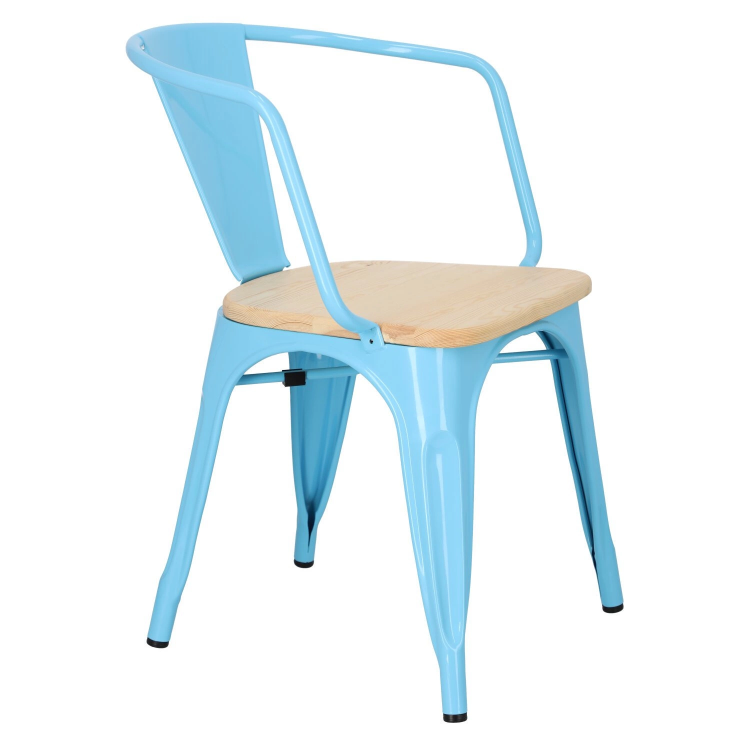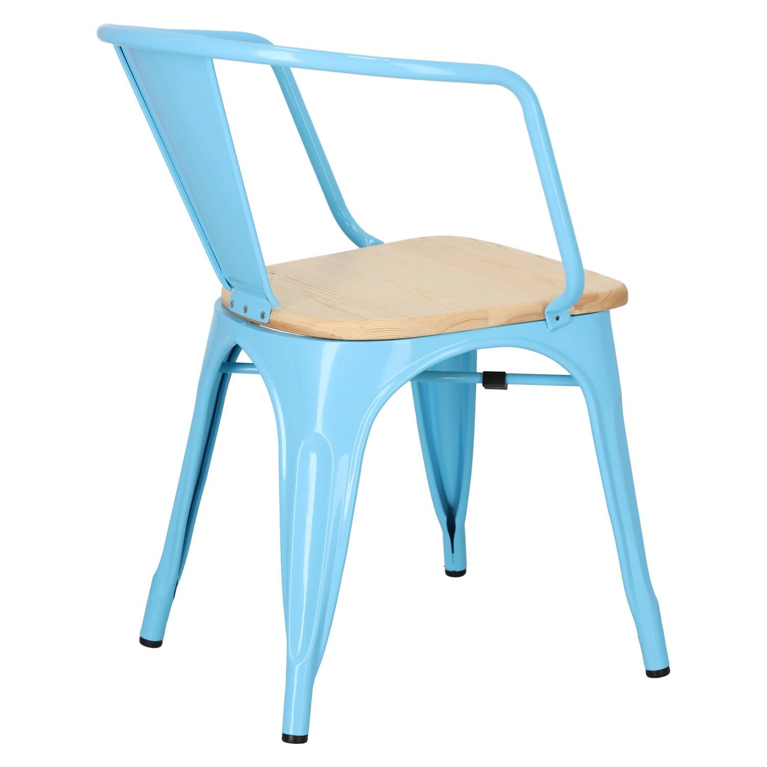 Metalowa konstrukcja, została podkreślona widocznymi elementami spawania, które od razu przynoszą na myśl dźwięki, wydobywające się z hut i starych fabryk. Nogi mebla zostały dodatkowo zabezpieczone gumowymi nakładkami, dzięki czemu pozostaje on stabilny i nie niszczy podłogi podczas przesuwania. Surowy charakter krzesła przełamuje starannie wykonane lakierowane siedzisko z lakierowanego drewna sosnowego. Jest ono dzięki temu gładkie i łatwe do utrzymania w czystości. Oparcie krzesła posiada charakterystyczny, niepełny kształt podtrzymywany przez cienką, metalową rurkę. Taka rama dodaje z pewnością lekkości, na pozór ciężkiemu industrialnemu meblowi. Krzesło Paris Arms Wood wykonane jest z trwałych materiałów, odpornych na uszkodzenia oraz jest dostępne w kilku atrakcyjnych kolorach, które poszerzają możliwości aranżacyjne, gdyż można je ze sobą dowolnie łączyć i tworzyć niepowtarzalne, przyciągające uwagę kombinacje.