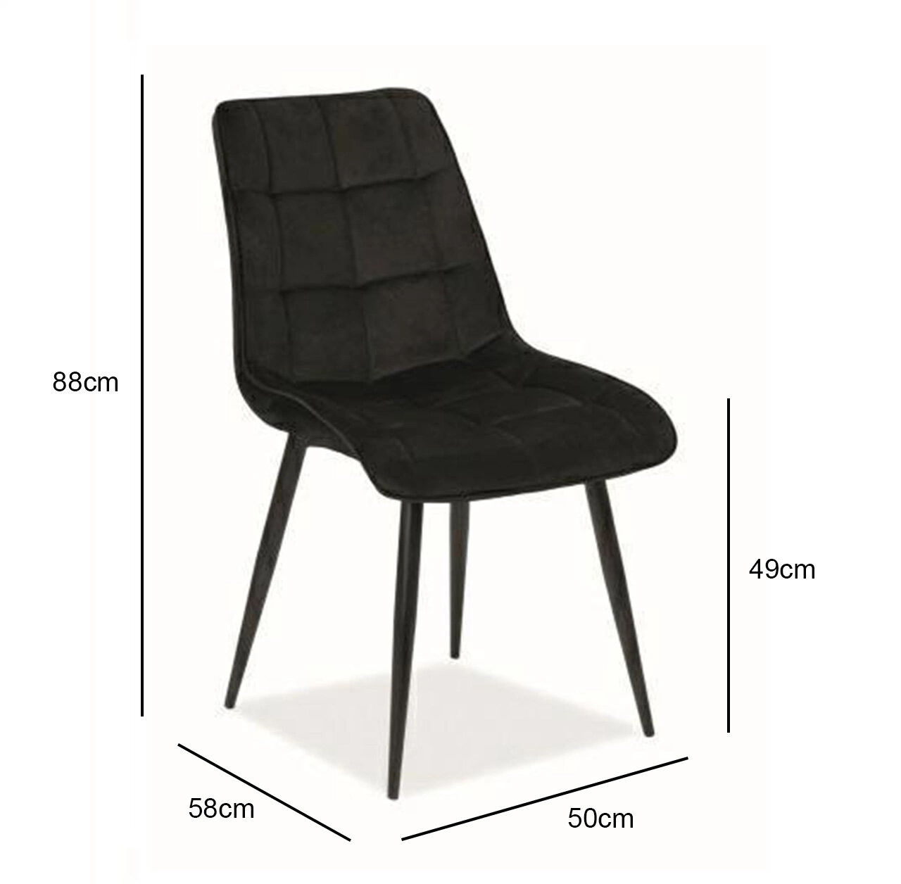 Tapicerowane krzesło z aksamitu w kolorze czarnym z wzorem w kratkę. Regularnie pikowane siedzisko jest niezwykle wygodne i posiada wyprofilowane oparcie. Metalowe, malowane na czarno nogi są odporne na uszkodzenia i zakończone stopkami z tworzywa sztucznego.