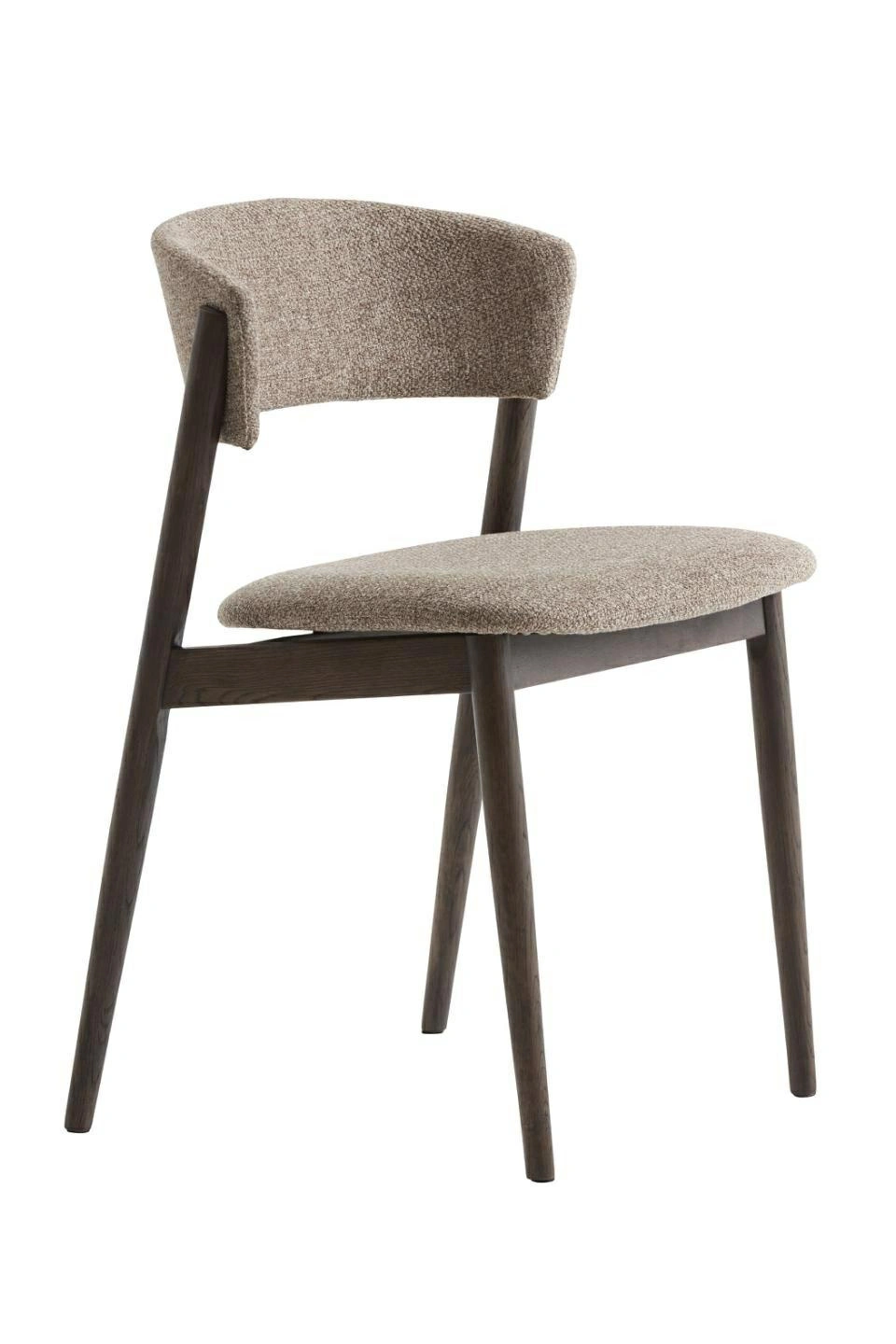Krzesło do jadalni Revere marki UNIQUE to tapicerowany model w beżowym kolorze, osadzony na dębowych nogach w ciemnobrązowym wybarwieniu. Kompaktowa forma o wymiarach 53,5 × 51 cm i wysokości 77 cm sprawia, że świetnie odnajduje się przy stole, nie przytłaczając wnętrza. To krzesło do jadalni łączy wygodę miękkiego siedziska z ponadczasowym, skandynawskim wyglądem.