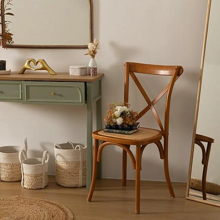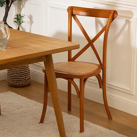 Krzesło drewniane Isak Atmosphera to kwintesencja stylu vintage, łącząca w sobie naturalne drewno dębowe i wyplatane siedzisko z rattanu w odcieniu beżu. Dzięki wymiarom 88 × 48 × 54 cm oraz wygodnemu oparciu, ten klasyczny mebel świetnie sprawdzi się jako krzesło do jadalni, kuchni, salonu czy stylowej kawiarni. Sztaplowana konstrukcja umożliwia oszczędność miejsca, a brak potrzeby montażu gwarantuje natychmiastową gotowość do użytku.