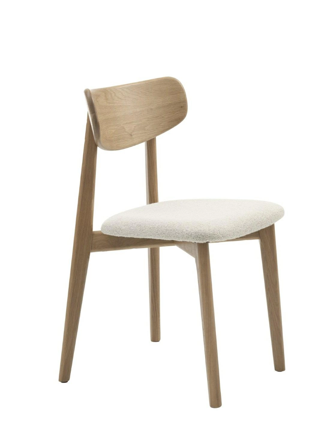 Krzesło drewniane Milos marki UNIQUE Furniture to połączenie naturalnego drewna dębowego z miękką tkaniną boucle w odcieniu bieli. Wyjątkowy komfort użytkowania zapewnia tapicerowane siedzisko i ergonomiczne oparcie, a uniwersalne wymiary (wysokość 81 cm, szerokość 46,5 cm, głębokość 49 cm) czynią ten model idealnym wyborem do jadalni, salonu i kuchni. Skandynawski, nowoczesny design oraz matowe wykończenie podkreślają ponadczasowy charakter tego krzesła do jadalni.