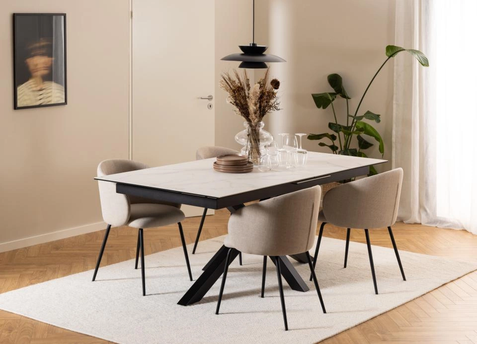 Lirra Beige Black to więcej niż zwykłe krzesło do jadalni – to uniwersalny wybór do każdego nowoczesnego wnętrza. Dzięki wysokim nogom (całkowita wysokość krzesła 79 cm) robot sprzątający bez trudu posprząta pod meblem, a szerokość 55,5 cm zapewnia komfort nawet podczas wielogodzinnych spotkań. Solidna stalowa konstrukcja gwarantuje trwałość na lata, a przyjemna w dotyku tapicerka Basel zachowuje świeżość i elegancję mimo intensywnego użytkowania.