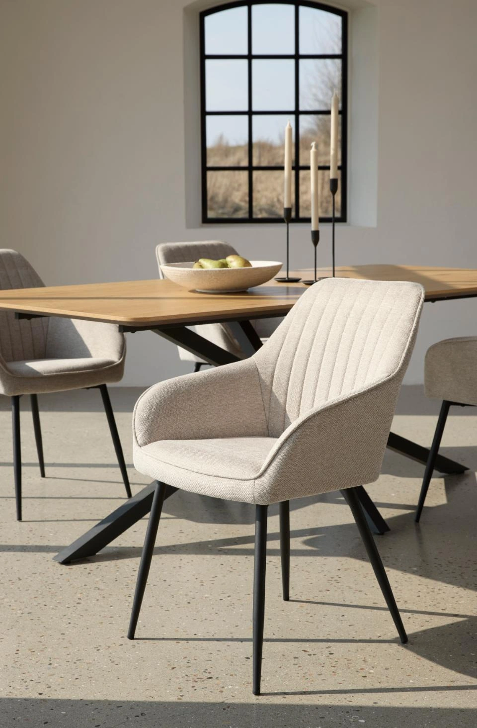 Krzesło Nolan marki UNIQUE to nowoczesne krzesło do jadalni w piaskowym kolorze, które łączy miękkie tapicerowane siedzisko z wygodnymi podłokietnikami i stabilną podstawą na czterech czarnych nogach. Dzięki wymiarom 58 × 59,5 cm oraz wysokości siedziska 48,5 cm łatwo dopasujesz je do większości stołów, tworząc komfortowe miejsce do codziennych posiłków, spotkań z bliskimi lub pracy przy stole. To model, który dobrze odnajduje się także jako krzesło do salonu lub krzesło do kuchni, jeśli zależy Ci na spójnym, nowoczesnym wystroju.