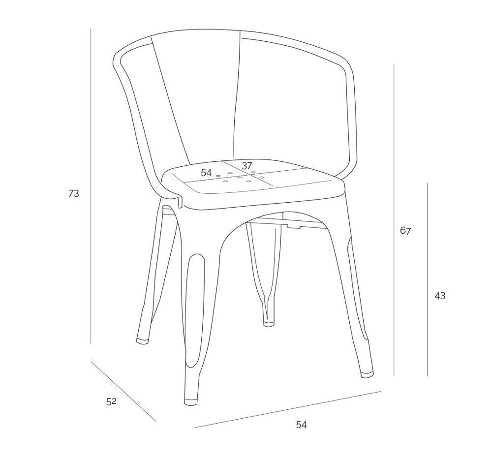 Metalowa konstrukcja, została podkreślona widocznymi elementami spawania, które od razu przynoszą na myśl dźwięki, wydobywające się z hut i starych fabryk. Nogi mebla zostały dodatkowo zabezpieczone gumowymi nakładkami, dzięki czemu pozostaje on stabilny i nie niszczy podłogi podczas przesuwania. Oparcie krzesła posiada charakterystyczny, niepełny kształt podtrzymywany przez cienką, metalową rurkę. Taka rama dodaje z pewnością lekkości, na pozór ciężkiemu industrialnemu meblowi. Krzesło Paris Arms wykonane jest z trwałych materiałów, odpornych na uszkodzenia oraz jest dostępne w kilku atrakcyjnych kolorach, które poszerzają możliwości aranżacyjne, gdyż można je ze sobą dowolnie łączyć i tworzyć niepowtarzalne, przyciągające uwagę kombinacje.