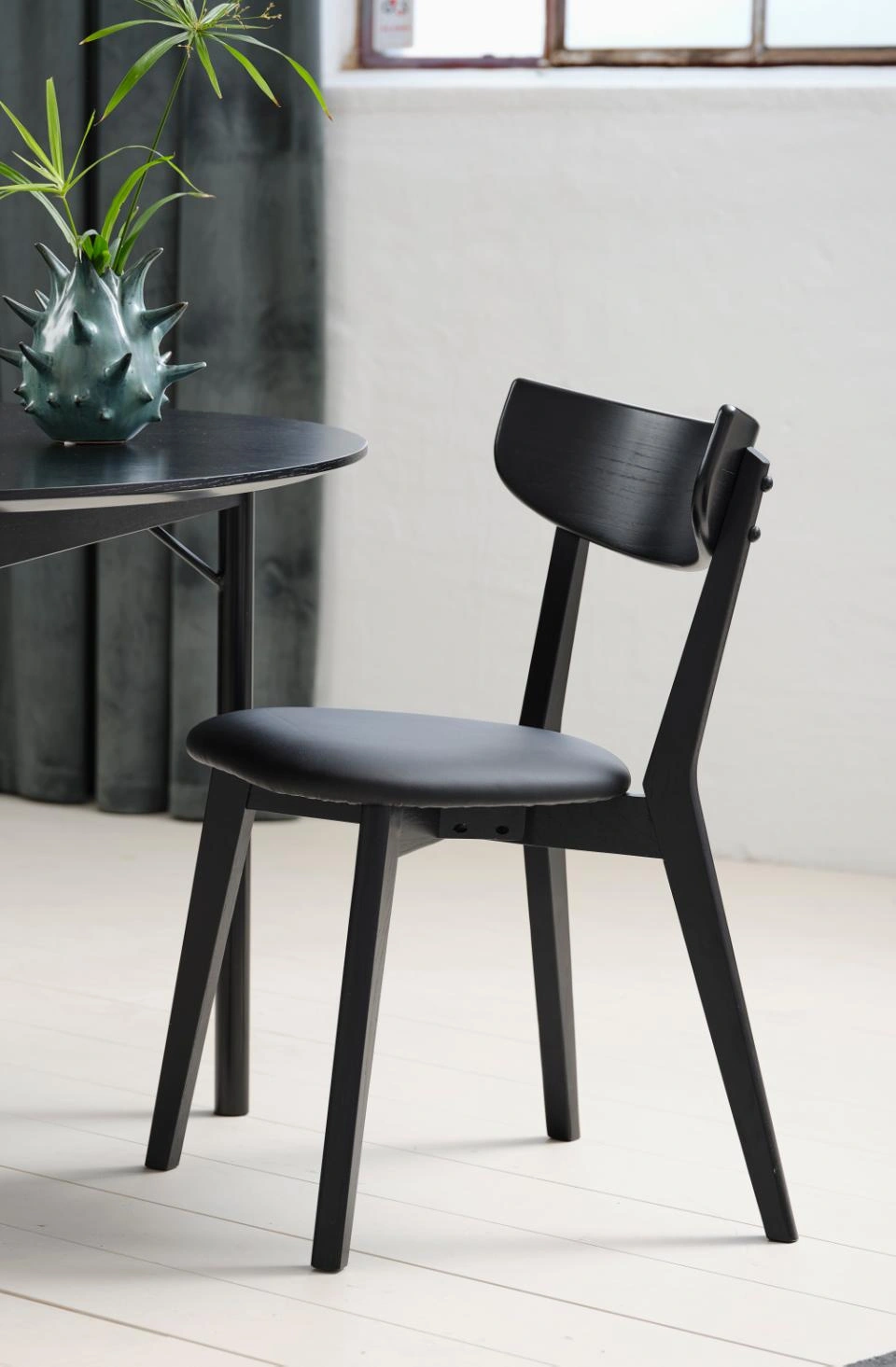 Krzesło Pero marki UNIQUE to nowoczesne krzesło do jadalni w czarnym kolorze, które łączy tapicerowane siedzisko z ekoskóry z solidną podstawą z drewna dębowego. Smukła forma, wygodna wysokość siedziska 48,5 cm i kompaktowy rozmiar 47,5 × 50 cm sprawiają, że model świetnie odnajduje się przy stole, nie przytłaczając wnętrza. To propozycja dla osób, które szukają mebla wygodnego, łatwego w pielęgnacji i spójnego z nowoczesną aranżacją.
