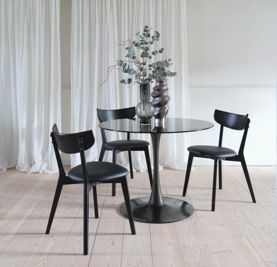 Pero to krzesło tapicerowane, które dobrze wygląda zarówno w jadalni, jak i w kuchni czy salonie z częścią stołową. Czarna kolorystyka nadaje mu elegancki, uporządkowany charakter, a prosta sylwetka bez podłokietników pozwala wygodnie wsunąć krzesło pod blat. Dzięki temu łatwiej utrzymać ład przy stole i lepiej wykorzystać dostępną przestrzeń, zwłaszcza w mniejszych mieszkaniach.