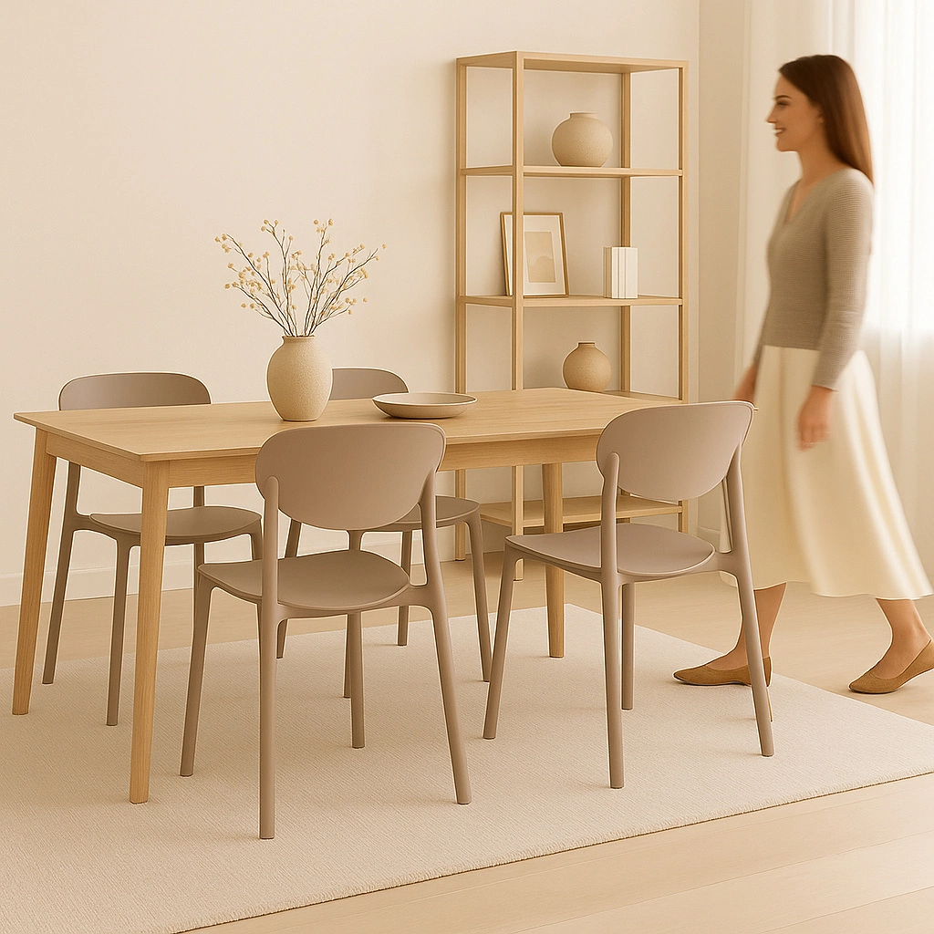 Model Plasta został zaprojektowany z myślą o praktycznym przechowywaniu – możliwość sztaplowania pozwala układać kilka krzeseł jedno na drugim. To wygodne rozwiązanie, gdy potrzebujesz większej liczby miejsc siedzących tylko okazjonalnie albo dysponujesz niewielką kuchnią czy balkonem.