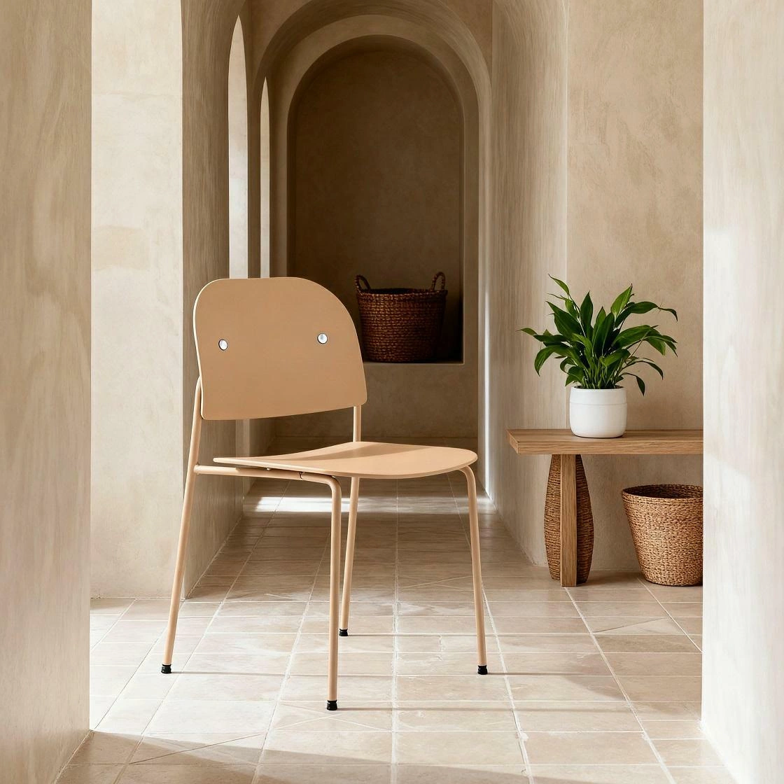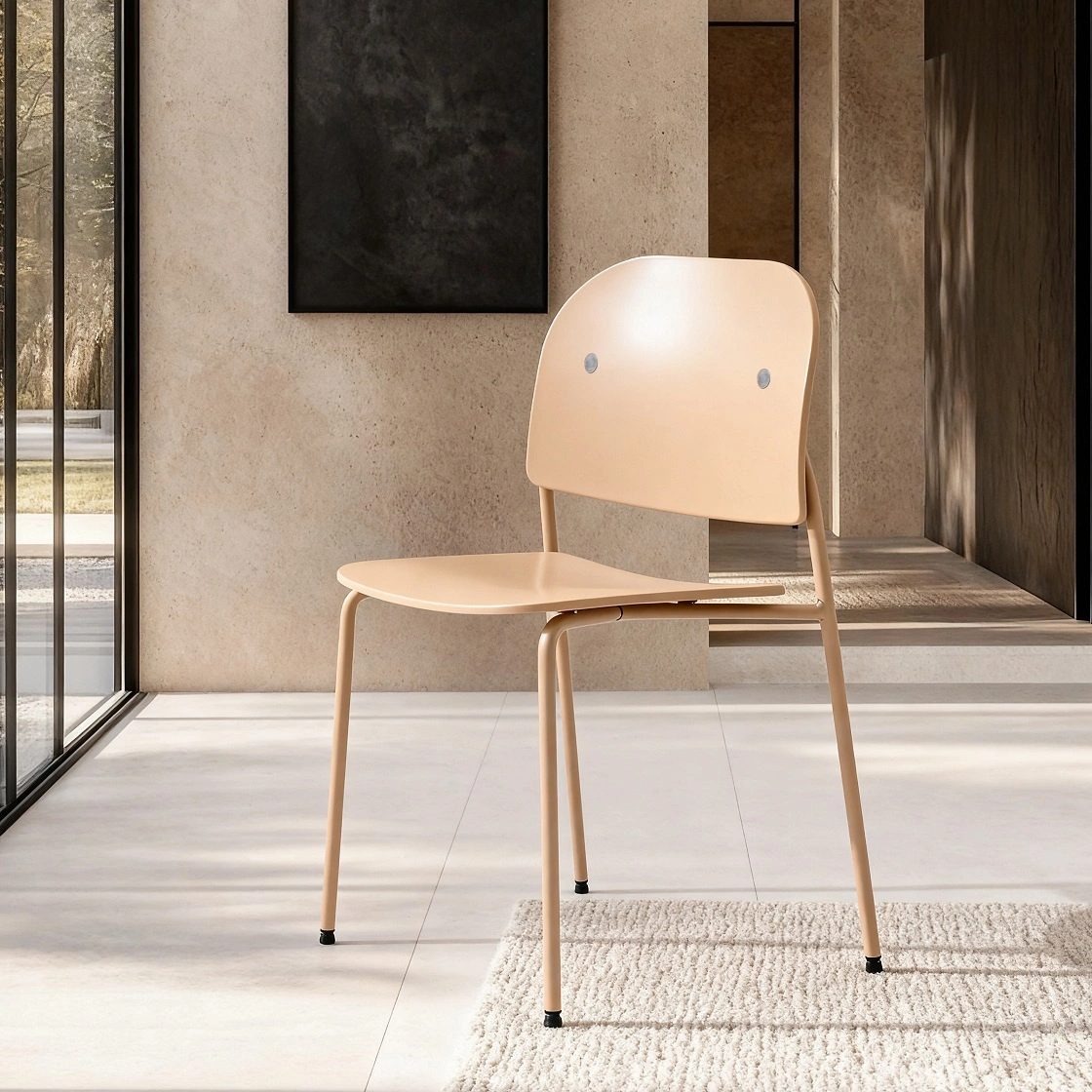 Krzesło Ravio marki Intesi to nowoczesne krzesło do jadalni i kuchni wykonane z wytrzymałego tworzywa w piaskowym kolorze, wsparte na stalowych nogach. Łączy lekką, minimalistyczną formę z solidnym udźwigiem do 120 kg oraz praktyczną funkcją sztaplowania, dzięki czemu sprawdzi się zarówno w domu, jak i w restauracji czy sali konferencyjnej.