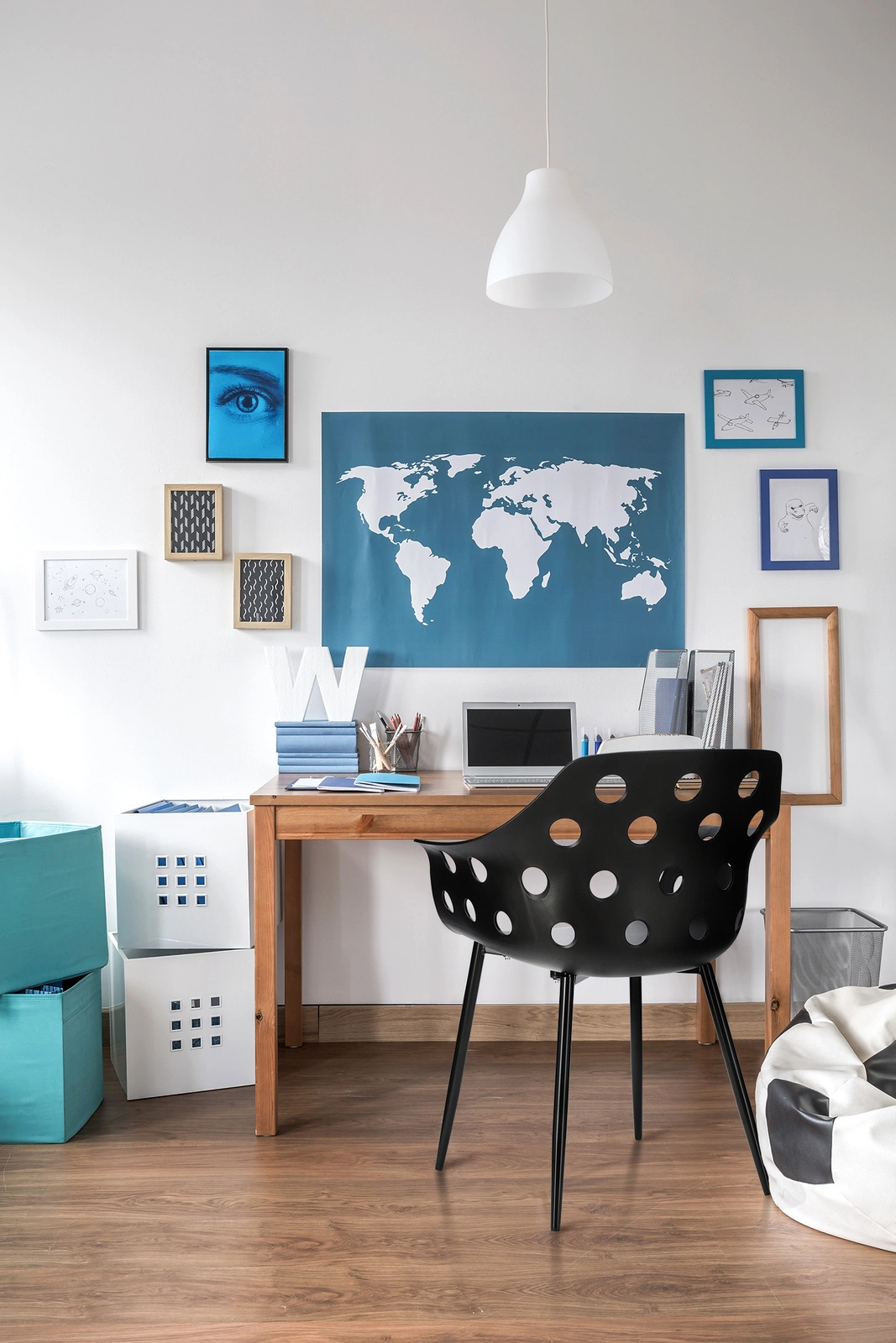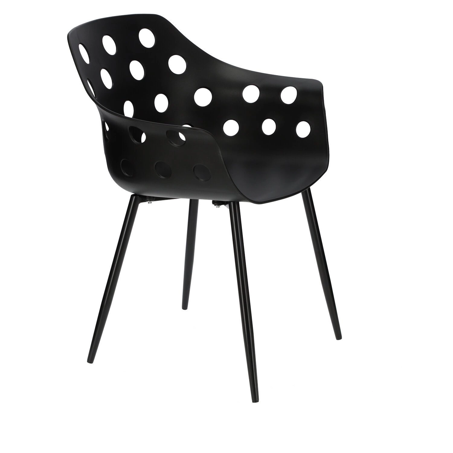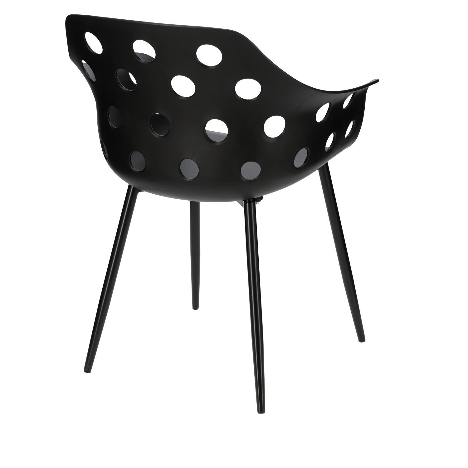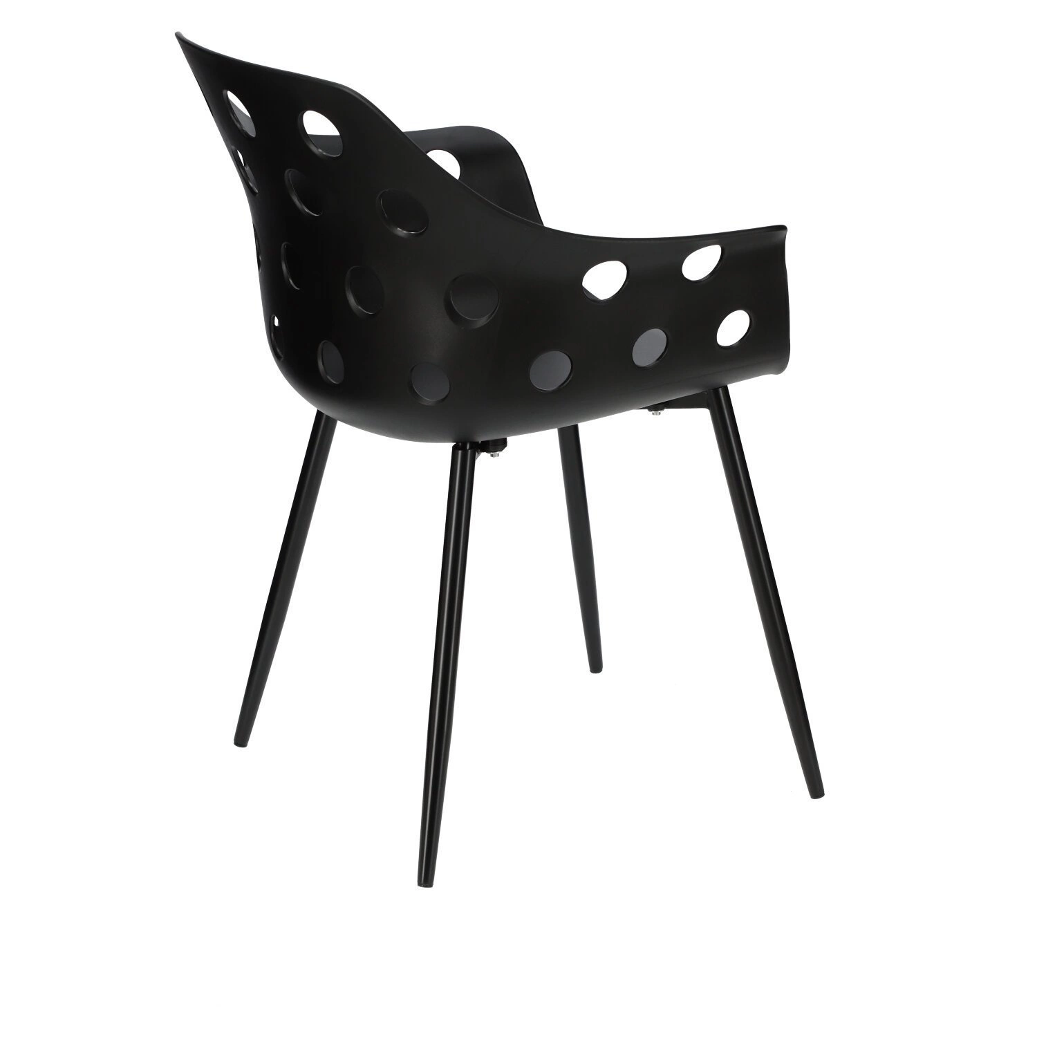 Siedzisko krzesła posiada wycięte okrągłe otwory. Geometryczne kształty nawiązują do stylu art deco.