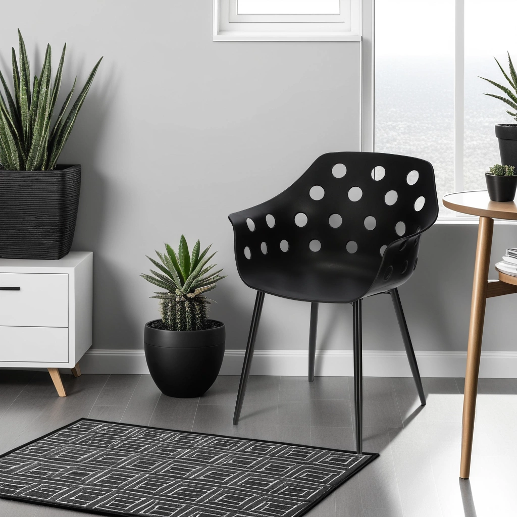 Nowoczesne krzesło Sajt to przede wszystkim mebel do modnej jadalni lub stylowego pokoju młodzieżowego. Krzesło z tworzywa w kolorze czarnym jest niezwykle wytrzymałe ze względu na materiał, z którego zostało zrobione.