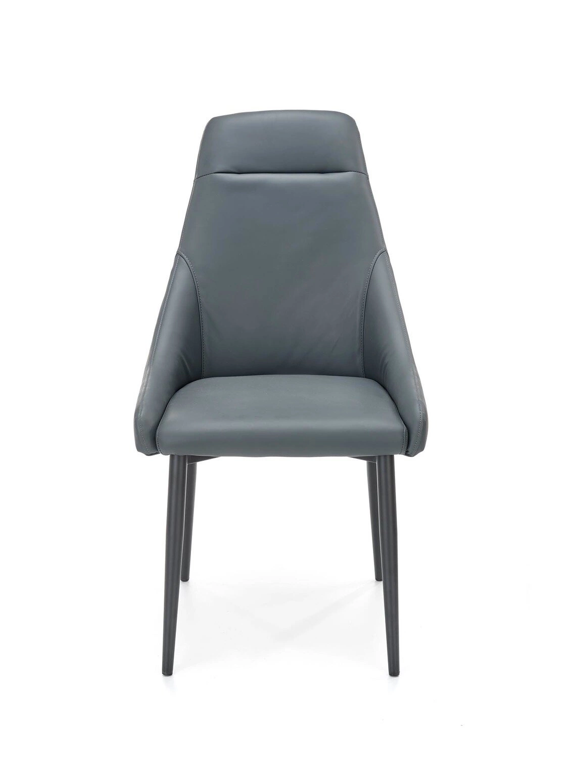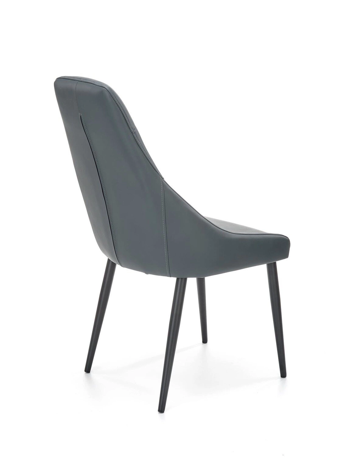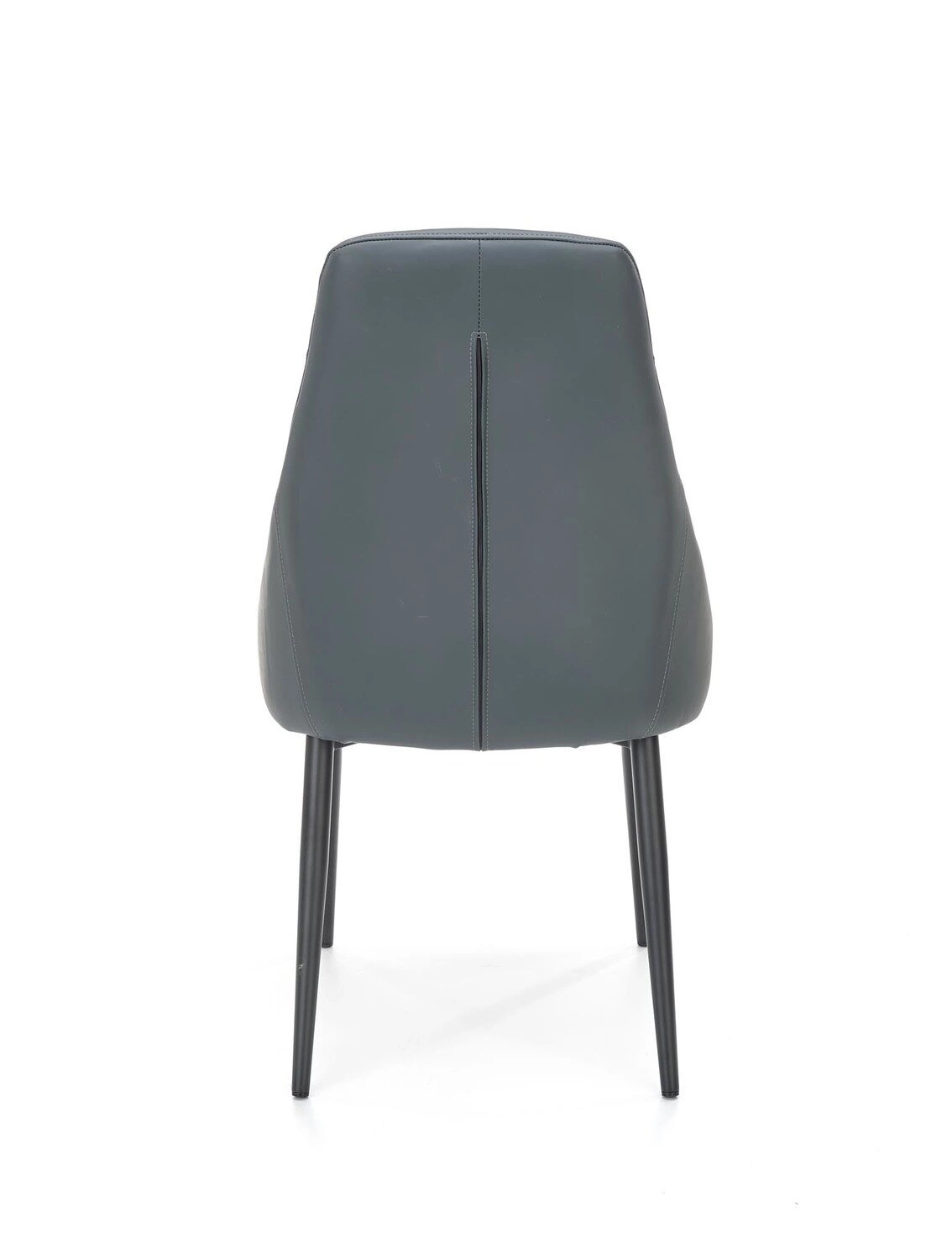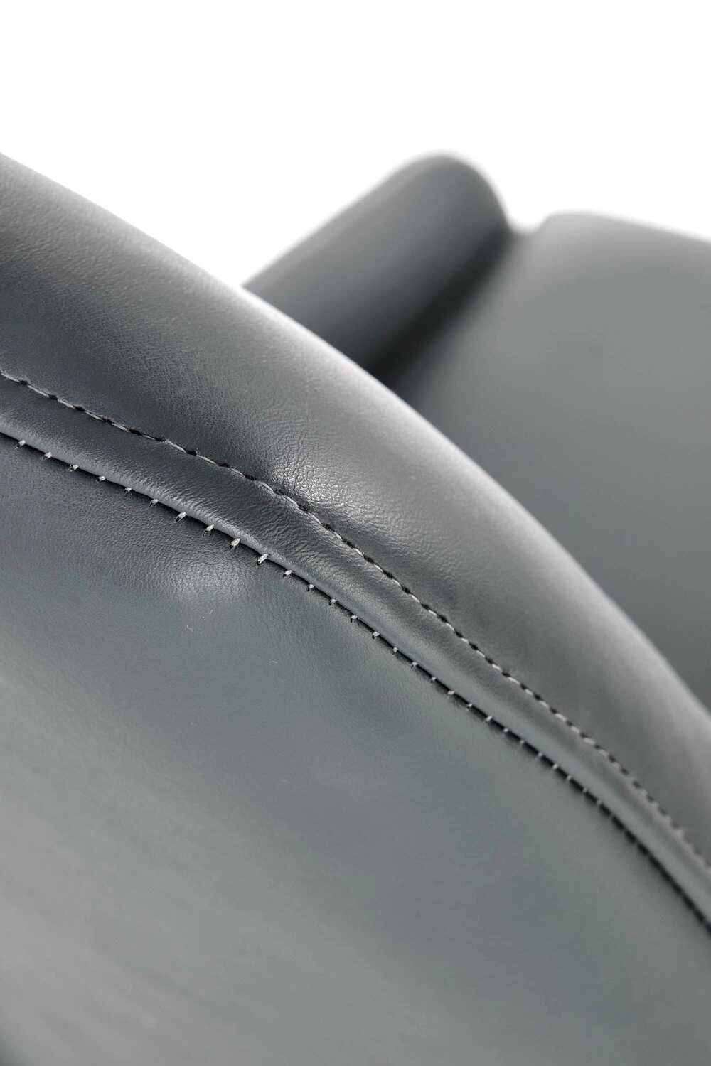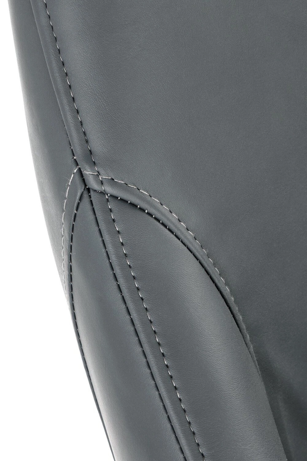 - Ekoskóra w ciemnym popielatym kolorze, widoczne przeszycia oraz podstawa z malowanej proszkowo stali nadają mu unikalny wygląd