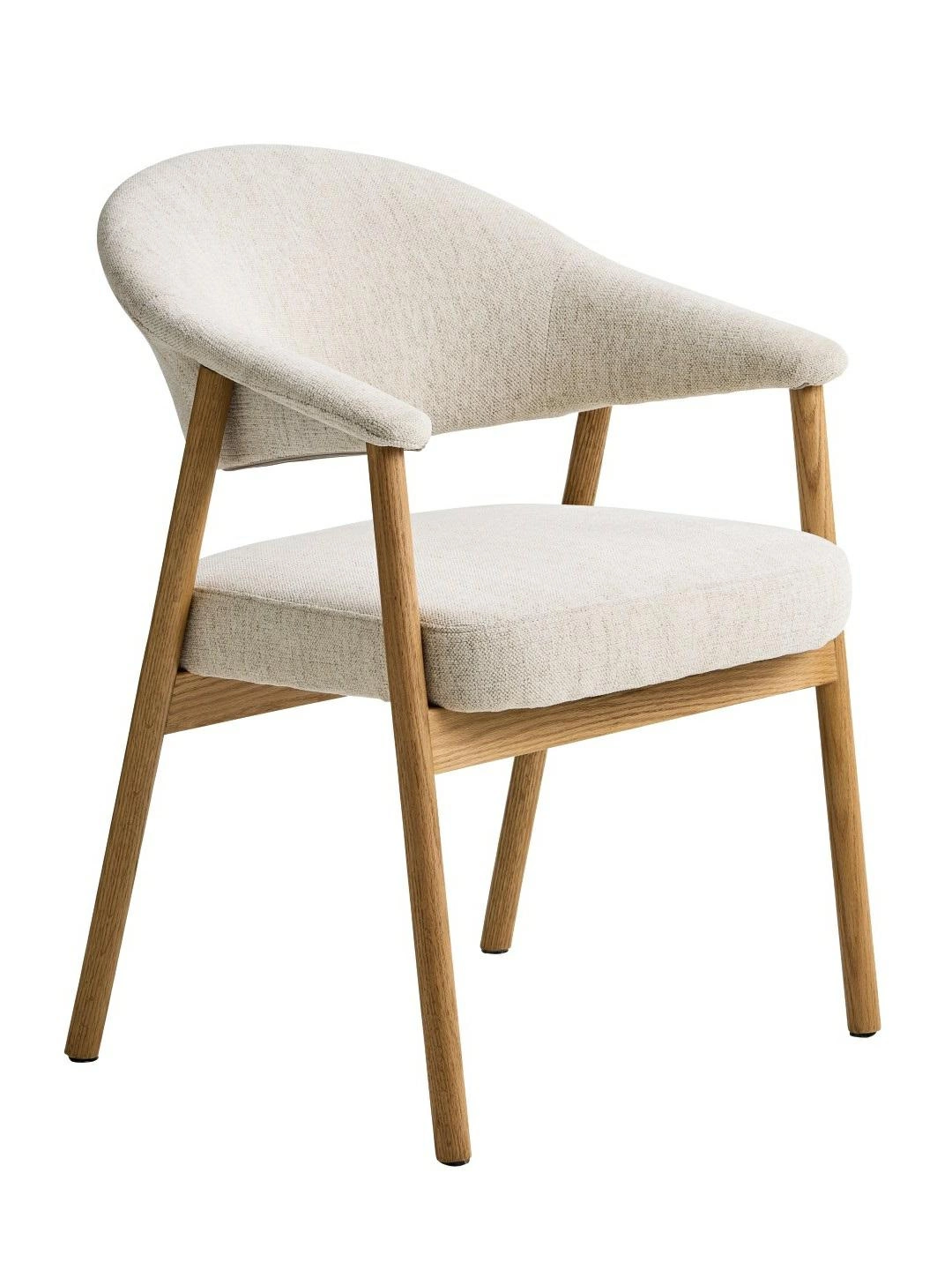 Wysokie, miękko tapicerowane oparcie i siedzisko umieszczone na wysokości 48,5 cm pozwalają wygodnie usiąść nawet podczas dłuższych spotkań przy stole. Drewniane podłokietniki zapewniają dodatkowe wsparcie dla ramion, odciążając kręgosłup. Stabilna podstawa z czterema szeroko rozstawionymi nogami gwarantuje pewność użytkowania, nawet przy maksymalnym obciążeniu do 120 kg.