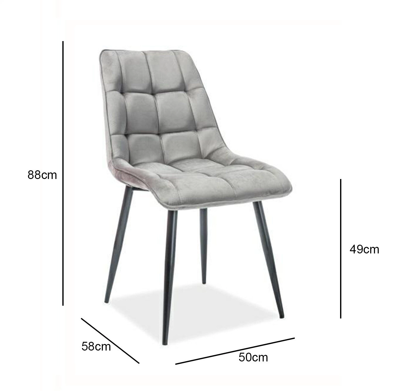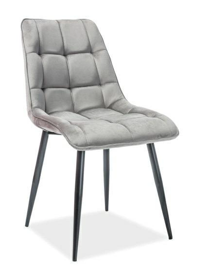 Tapicerowane krzesło z aksamitu w kolorze szarym z wzorem w kratkę. Regularnie pikowane siedzisko jest niezwykle wygodne i posiada wyprofilowane oparcie. Metalowe, malowane na czarno nogi są odporne na uszkodzenia i zakończone stopkami z tworzywa sztucznego.