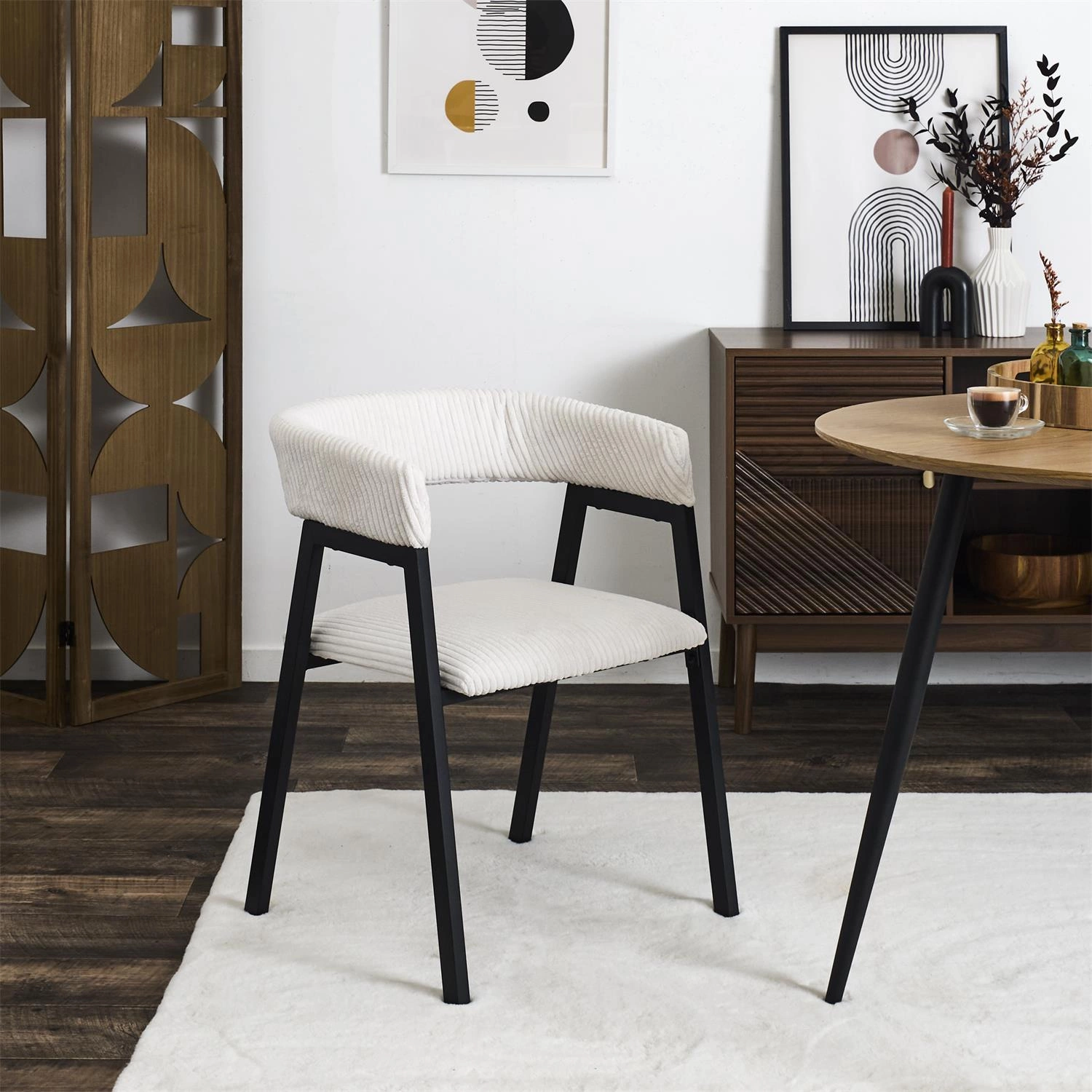 Połączenie białego siedziska z czarną, metalową podstawą to klasyka, która nigdy nie wychodzi z mody. Tkanina sztruksowa wprowadza do wnętrza przytulność i miękkość, a zastosowanie pianki tapicerskiej gwarantuje wysoki komfort siedzenia nawet podczas długotrwałego użytkowania. Krzesło Scott łatwo dopasować do innych mebli i dodatków – sprawdzi się zarówno przy stole w jadalni, jak i jako samodzielny akcent w salonie czy pokoju młodzieżowym.
