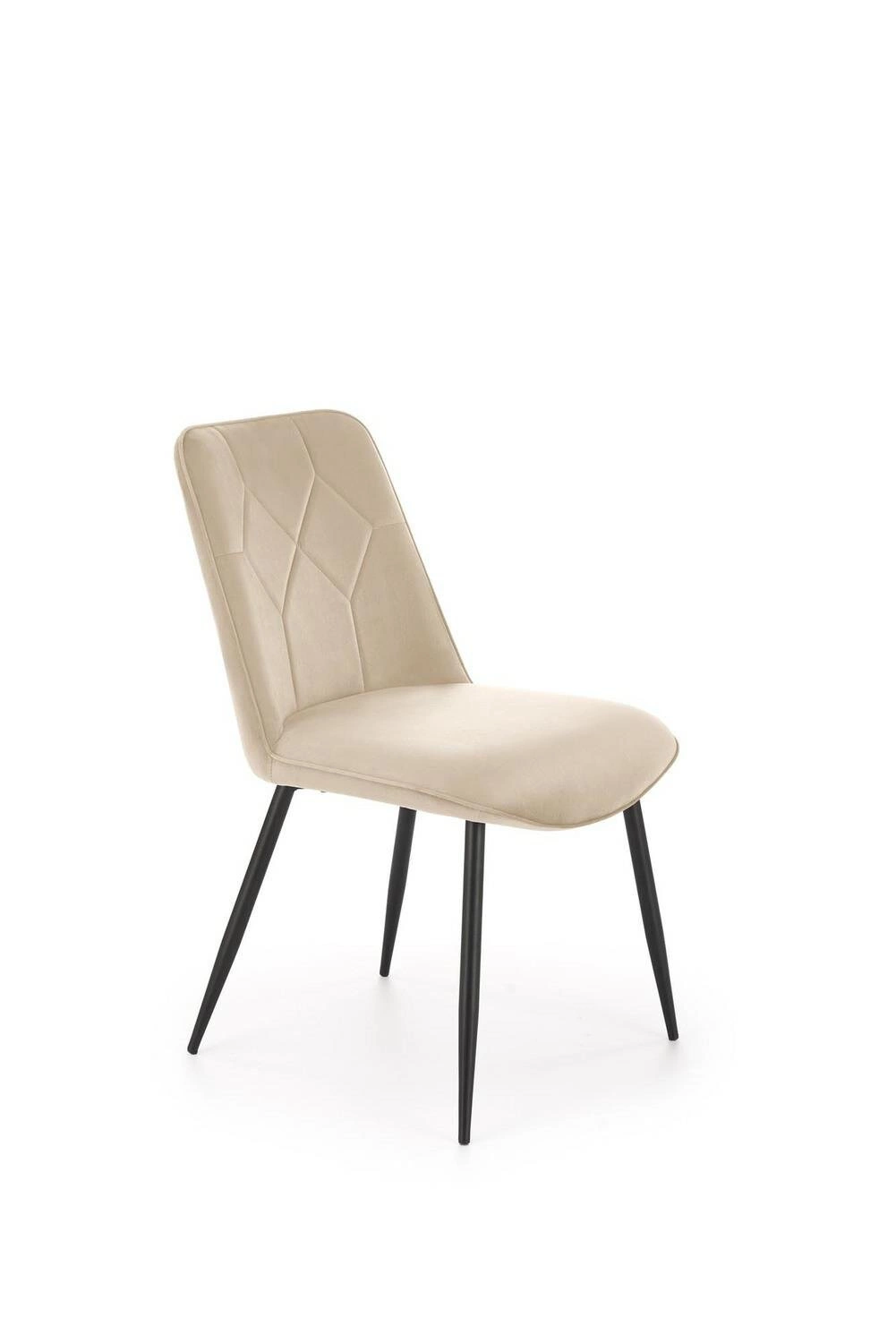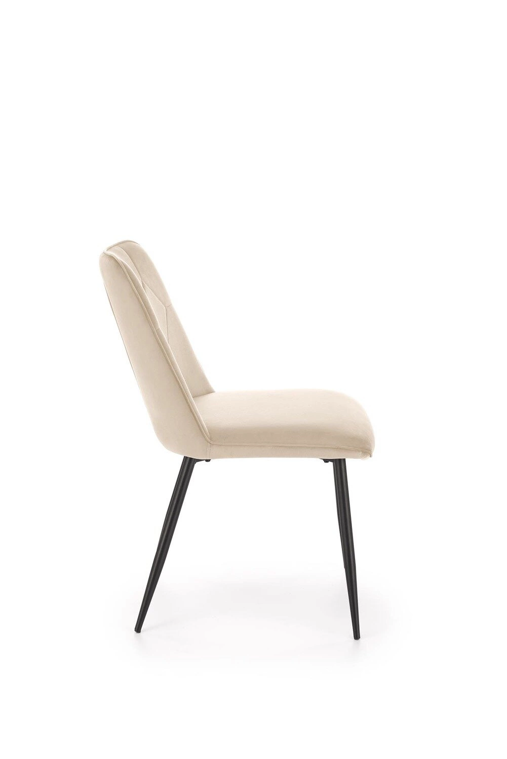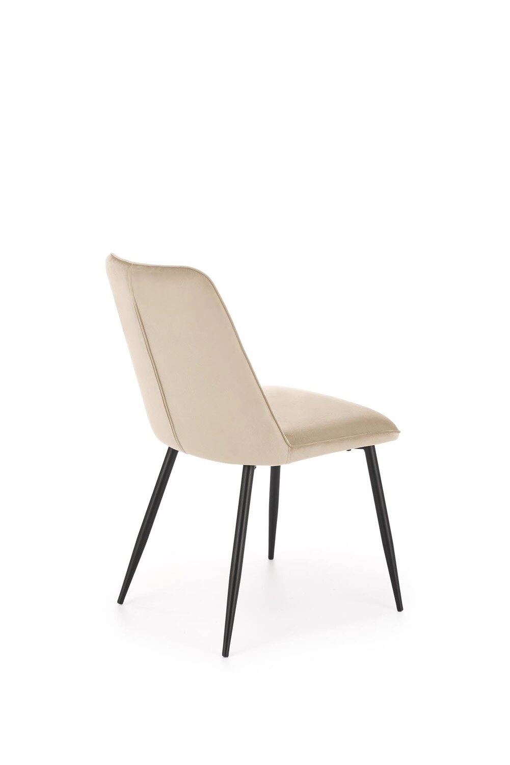 Siedzisko i oparcie zostały starannie obszyte wysokiej jakości welurem, który jest nie tylko estetyczny, ale i praktyczny—łatwo utrzymać go w czystości. Profilowane oparcie zapewnia wygodne podparcie pleców, co docenisz podczas rodzinnych posiłków lub pracy przy stole. Stabilność gwarantują cztery solidne, metalowe nogi malowane proszkowo na głęboki czarny kolor, które harmonijnie kontrastują z delikatną beżową tapicerką.