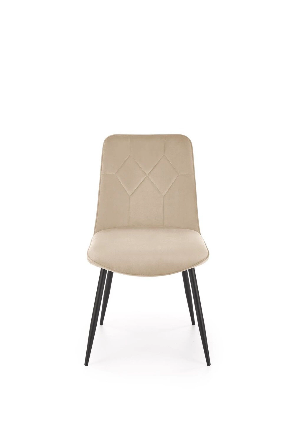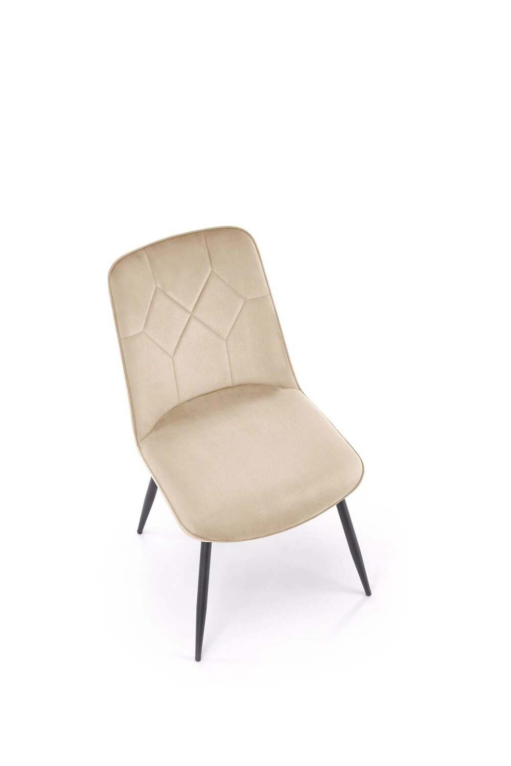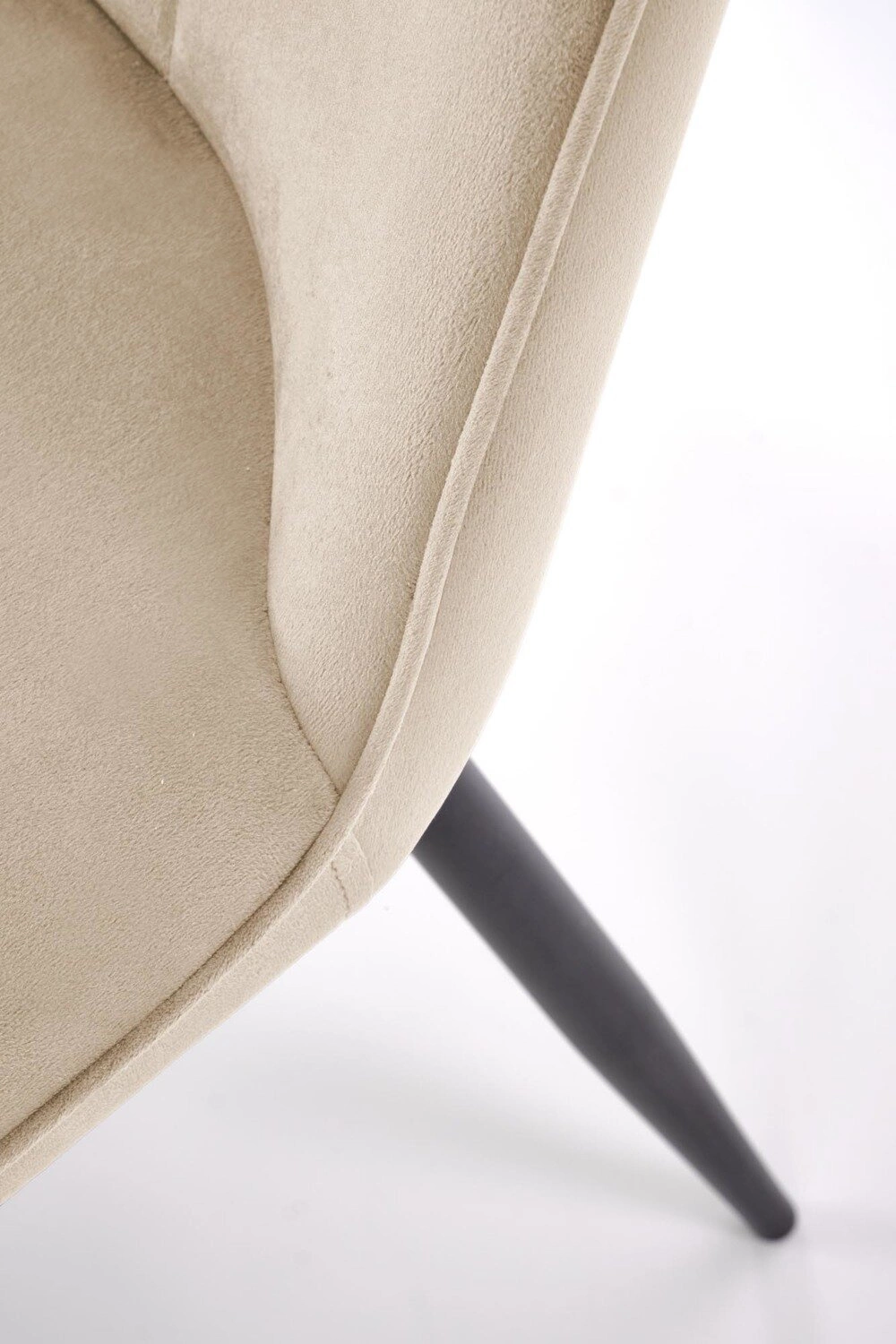 Siedzisko i oparcie zostały starannie obszyte wysokiej jakości welurem, który jest nie tylko estetyczny, ale i praktyczny—łatwo utrzymać go w czystości. Profilowane oparcie zapewnia wygodne podparcie pleców, co docenisz podczas rodzinnych posiłków lub pracy przy stole. Stabilność gwarantują cztery solidne, metalowe nogi malowane proszkowo na głęboki czarny kolor, które harmonijnie kontrastują z delikatną beżową tapicerką.
