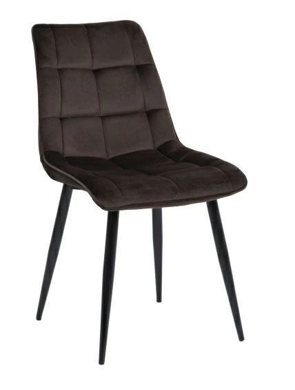 Tapicerowane krzesło z aksamitu w kolorze brązowym z wzorem w kratkę. Regularnie pikowane siedzisko jest niezwykle wygodne i posiada wyprofilowane oparcie. Metalowe, malowane na czarno nogi są odporne na uszkodzenia i zakończone stopkami z tworzywa sztucznego.