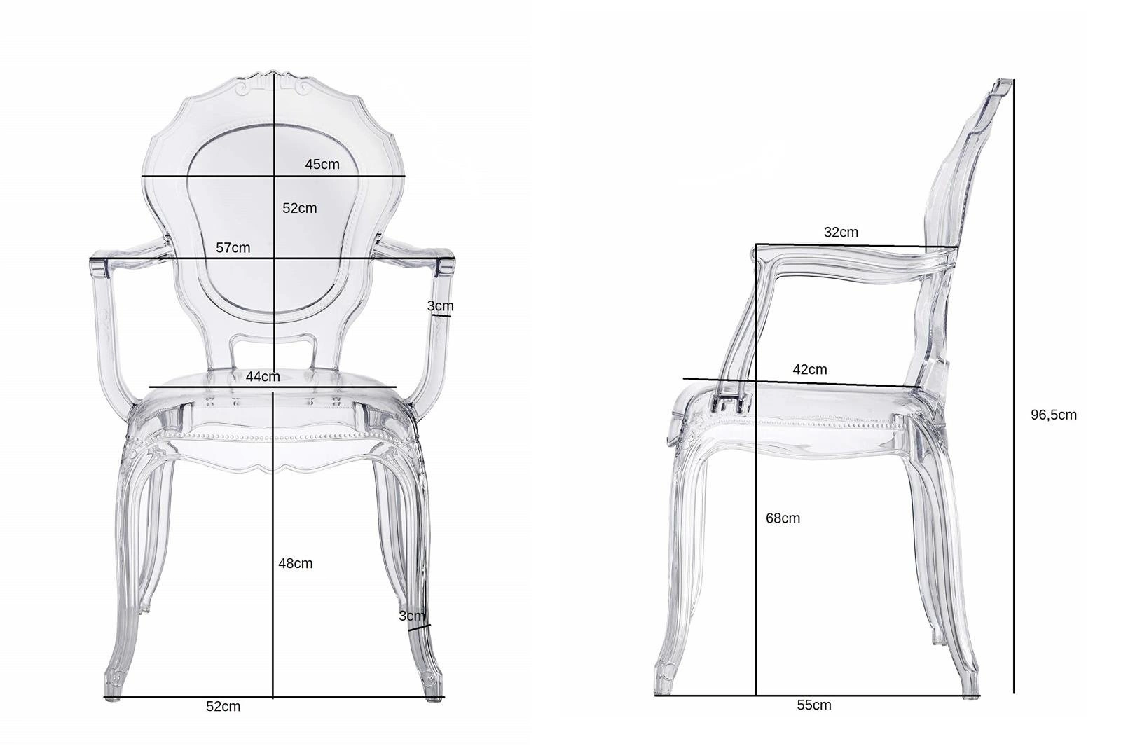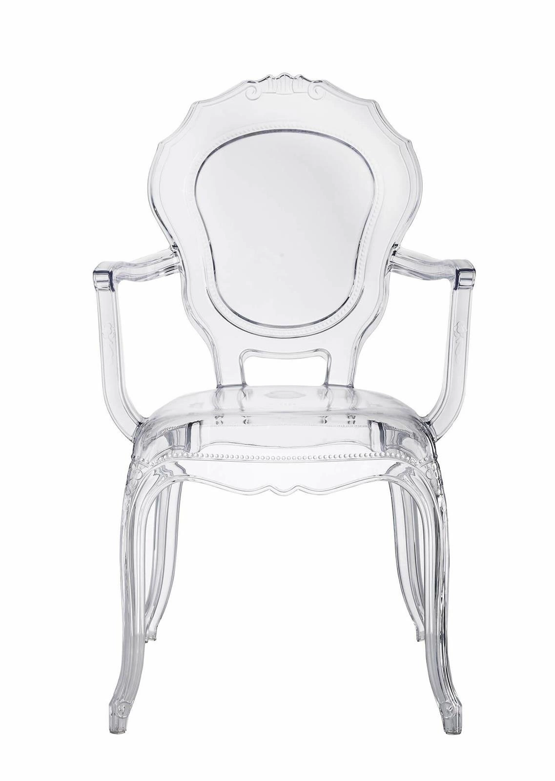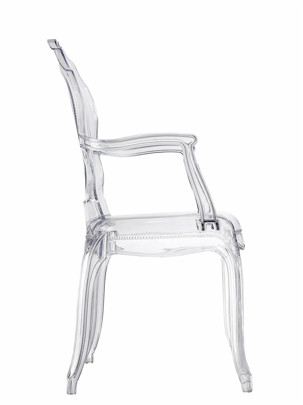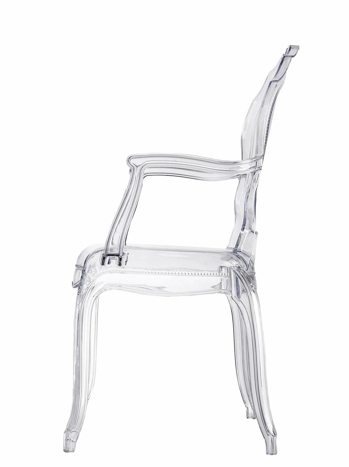 Krzesło transparentne Queen Arm to nowoczesna wariacja na temat mebli w stylu Ludwika XIV. Siedzisko z dekoracyjnymi zdobieniami oraz wygiętymi kabriolowymi nóżkami charakterystycznymi dla francuskiego baroku zyskały dzięki zaawansowanej technologii niebanalne, transparentne oblicze.