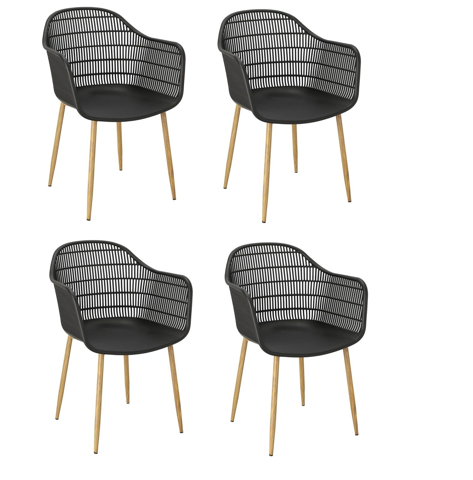 Zestaw 4 krzeseł Becker czarne/naturalne to idealny wybór dla osób ceniących połączenie nowoczesnego stylu z praktycznymi rozwiązaniami. Krzesła wyróżniają się designerską formą siedziska z podłokietnikami i oparciem przypominającymi siatkę, co nadaje im lekkości i oryginalności. Wytrzymałe tworzywo, z którego wykonano siedzisko, gwarantuje odporność na codzienne użytkowanie, a matowa powierzchnia sprawia, że łatwo utrzymać je w czystości. Stabilna podstawa z metalu, wykończona okleiną imitującą drewno dębowe, podkreśla naturalny charakter zestawu i doskonale komponuje się zarówno z nowoczesnymi, jak i klasycznymi wnętrzami. Zestaw sprawdzi się w kuchni, jadalni, poczekalni czy nawet domowym gabinecie, zapewniając wygodne miejsce do siedzenia podczas rodzinnych posiłków, spotkań z przyjaciółmi lub pracy przy biurku.