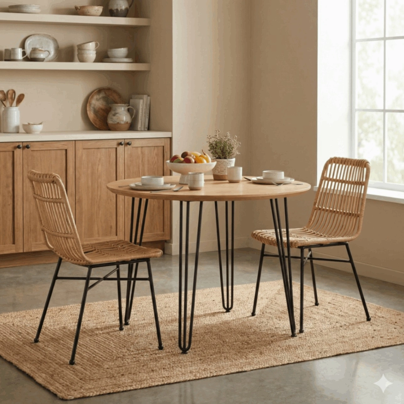 Zestaw Surabaya wpisuje się w styl boho, który łączy naturalność z wyrafinowaną prostotą. Kolor siedziska nawiązuje do jasnego drewna, a czarne nogi nadają całości nowoczesnego charakteru. Dzięki temu krzesła idealnie komponują się zarówno z drewnianymi stołami, jak i minimalistycznymi aranżacjami. Ich uniwersalna kolorystyka sprawia, że z łatwością dopasujesz je do różnych wnętrz i przestrzeni zewnętrznych, tworząc spójną i przytulną atmosferę podczas codziennych spotkań rodzinnych, pracy z domu czy wieczornych rozmów na tarasie.