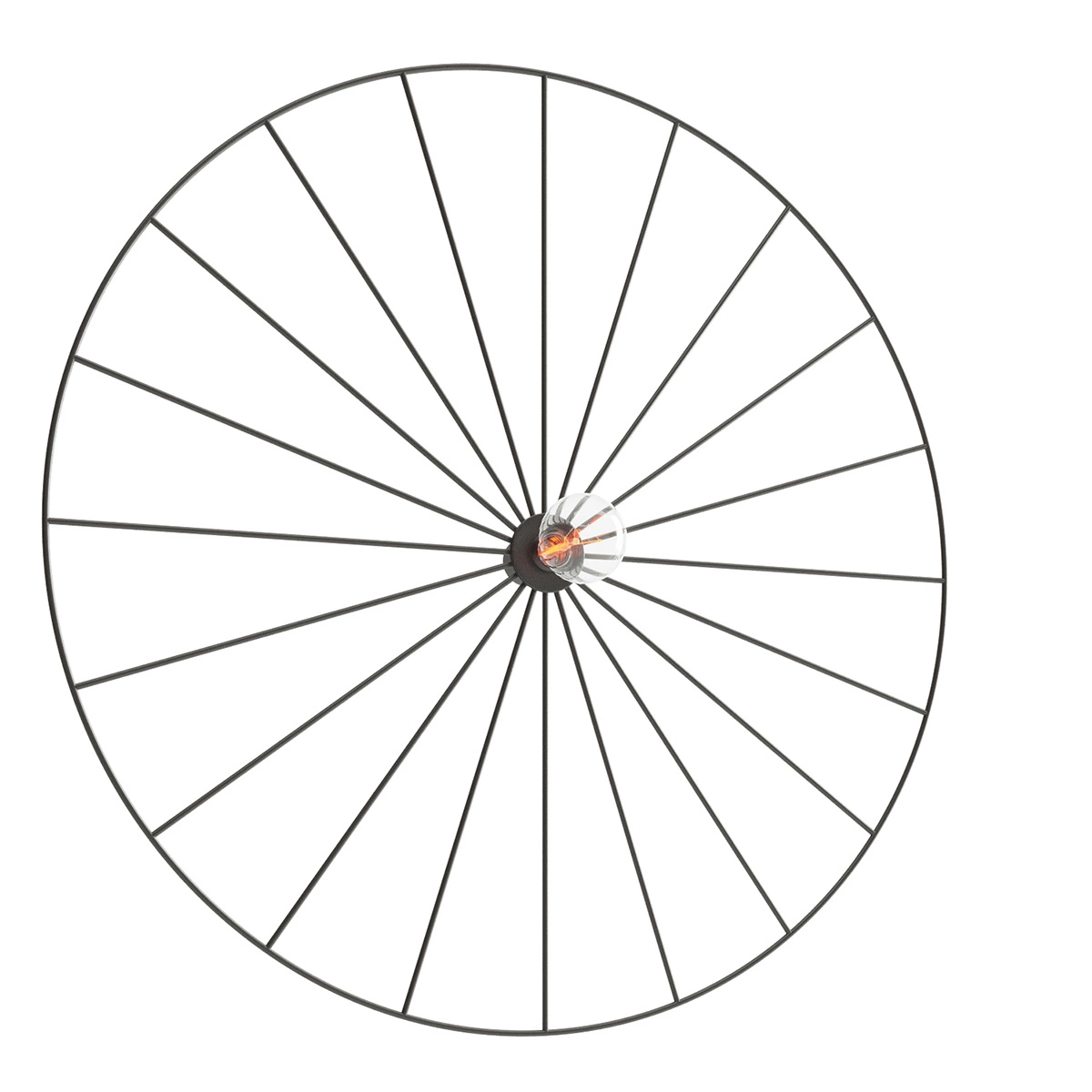 Plafon Sirkel o średnicy 60cm to metalowy abażur budową przypominający koło od wozu. Okrągły, płaski abażur z cienkimi czarnymi przęsłami wykonany został z metalu malowanego proszkowo na czarno.