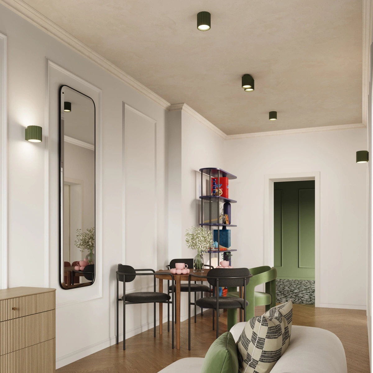 Nowoczesny kinkiet ścienny AURA przyciąga wzrok swoją prostą, ale wyrazistą bryłą. Cylindryczna forma i subtelne ryflowania czynią z niego świetny wybór do wnętrz urządzonych w stylu minimalistycznym lub modernistycznym. Oliwkowy odcień zieleni nadaje pomieszczeniu świeżości i wprowadza modny akcent kolorystyczny, jednocześnie nie dominując aranżacji. To idealna lampa na ścianę, gdy zależy Ci na harmonijnym połączeniu funkcji użytkowej z designerskim wyglądem.