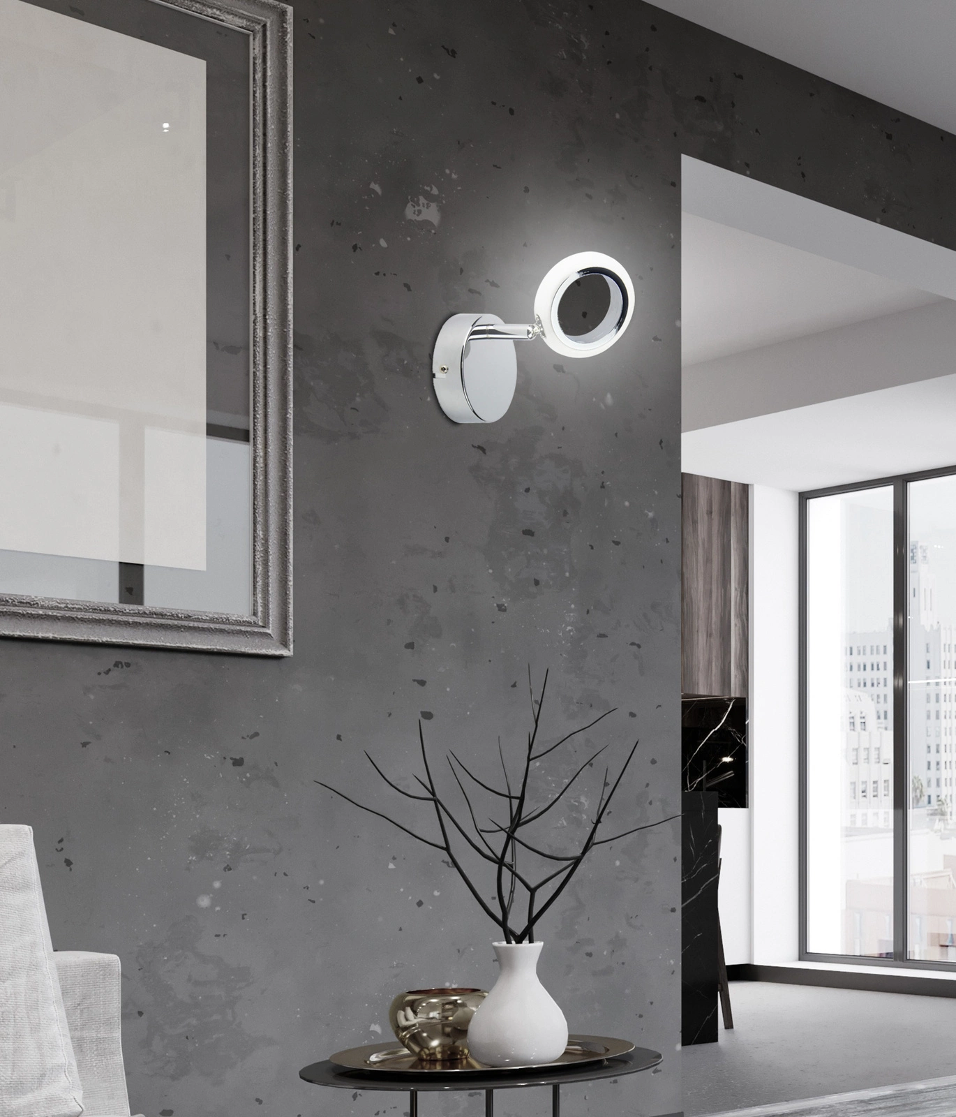 Stylowy kinkiet Aurelion to połączenie nowoczesnego designu z praktycznymi rozwiązaniami. Wykonany z chromowanego metalu, z obrotową główką i akrylowym kloszem, w którym ukryty jest ekonomiczny LED, jest nie tylko efektownym elementem dekoracyjnym, ale także bezpiecznym źródłem światła. Dzięki barwie światła 3000K tworzy przytulną atmosferę, idealną do relaksu po ciężkim dniu.