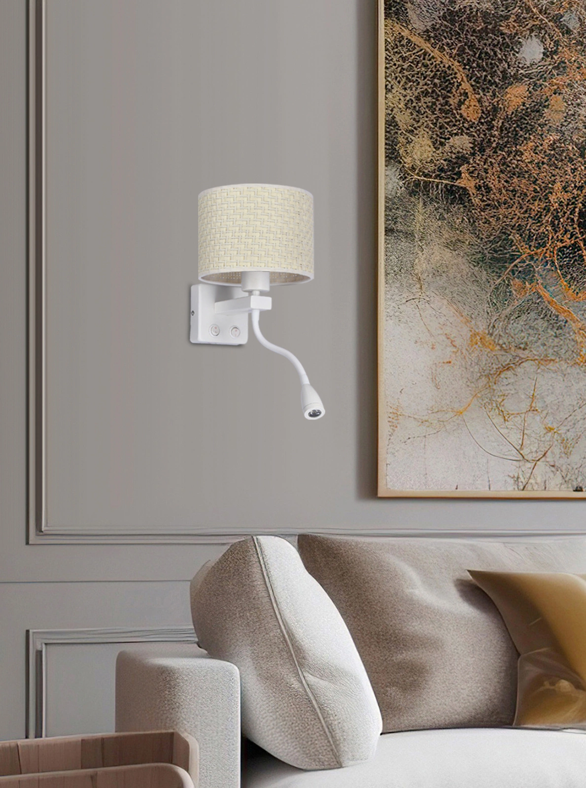 Prezentowany kinkiet Polo to połączenie nowoczesności i glamour w jednym. Wyposażony w oprawę żarówki E27, oferuje moc oświetlenia na poziomie 40W z dodatkowym 2W światła LED. Jego biały kolor doskonale komponuje się z kremowym abażurem wykonanym z tkaniny, co nadaje mu eleganckiego i stylowego wyglądu. Oświetlenie LED zapewnia nie tylko funkcjonalność, ale również oszczędność energii.