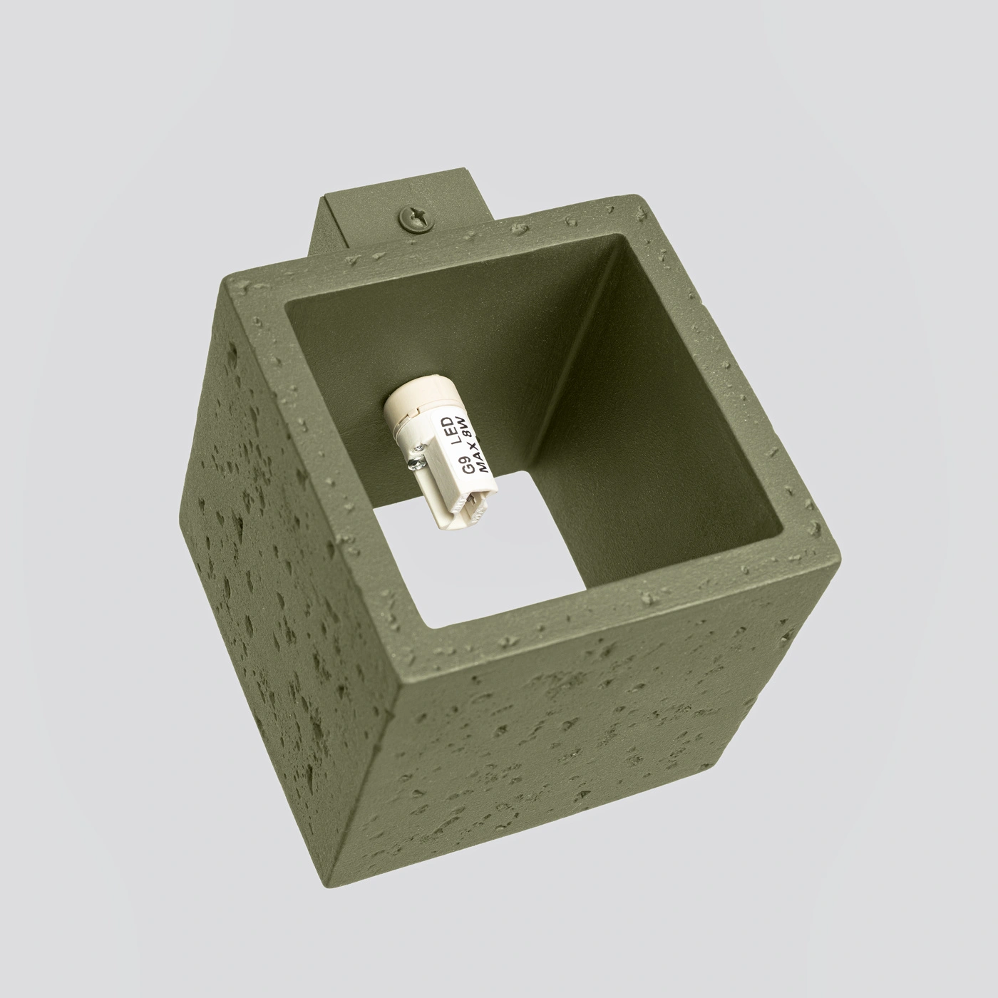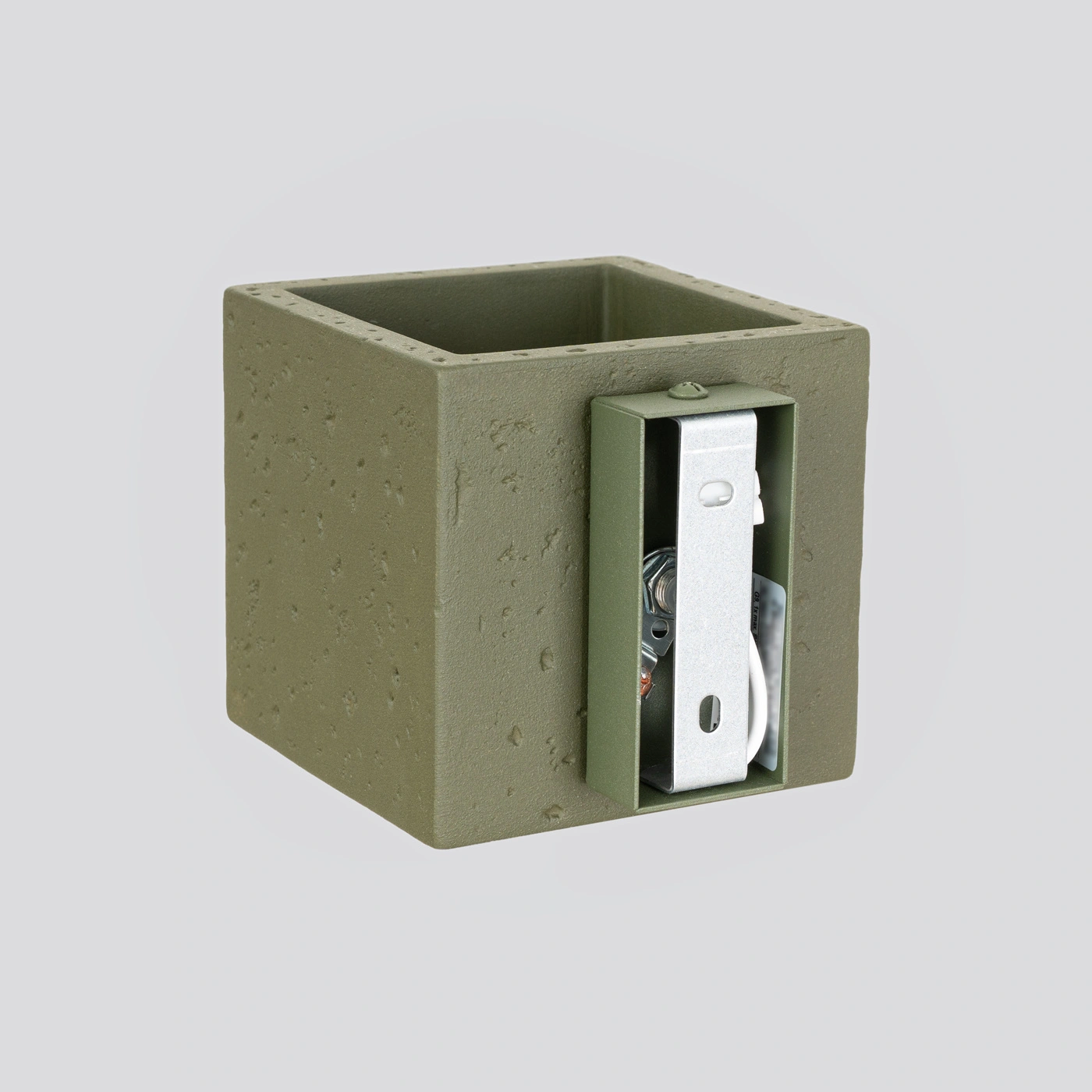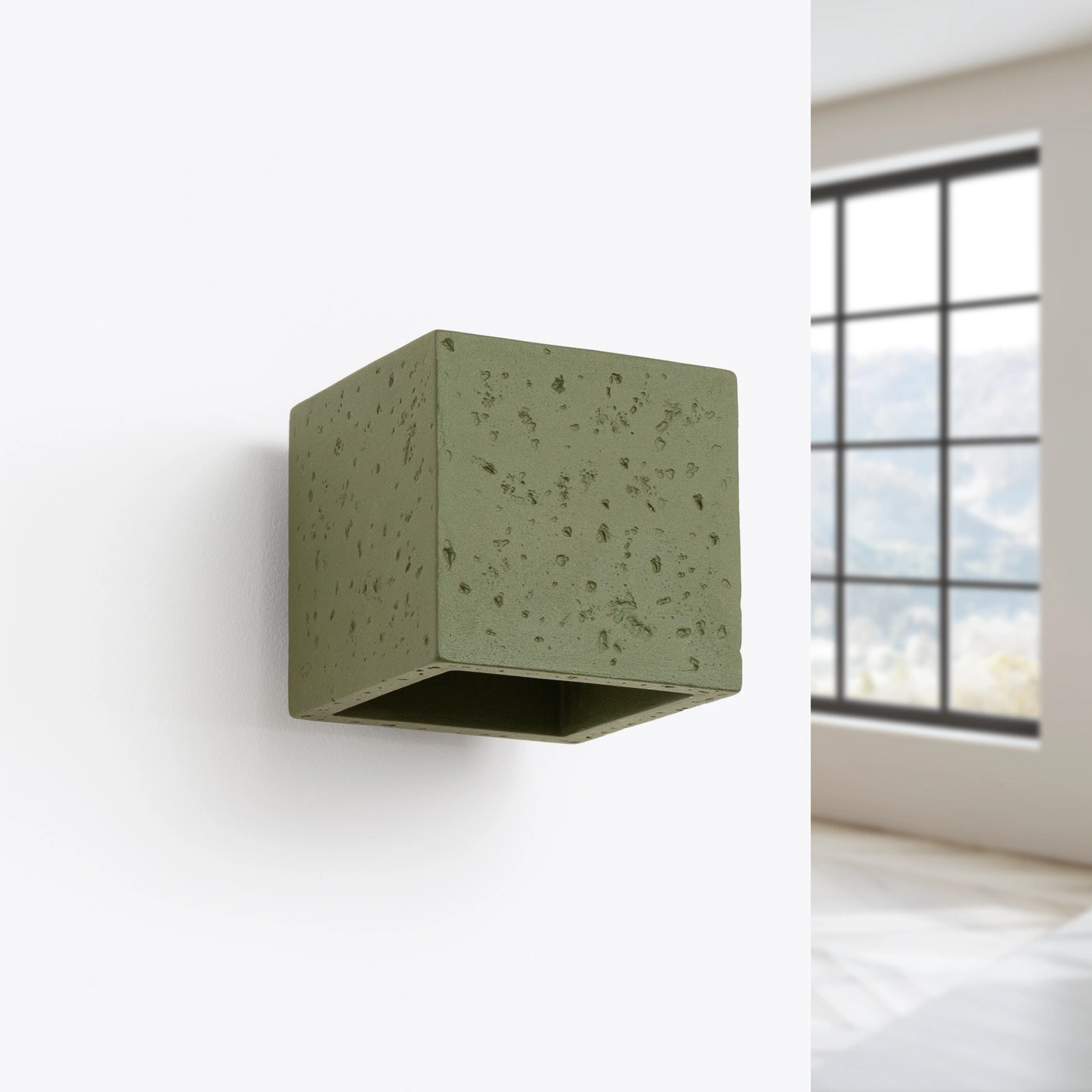 Kinkiet ścienny QUAD marki Sollux Lighting to nowoczesna lampa ścienna o wyrazistym, industrialnym charakterze. Wykonany z trwałego betonu w oryginalnym, oliwkowozielonym kolorze, stanowi nietuzinkową propozycję do salonu, sypialni, jadalni czy korytarza. Kompaktowe wymiary (wysokość 10 cm, szerokość 12 cm, głębokość 10 cm) pozwalają na łatwe dopasowanie do różnych aranżacji.