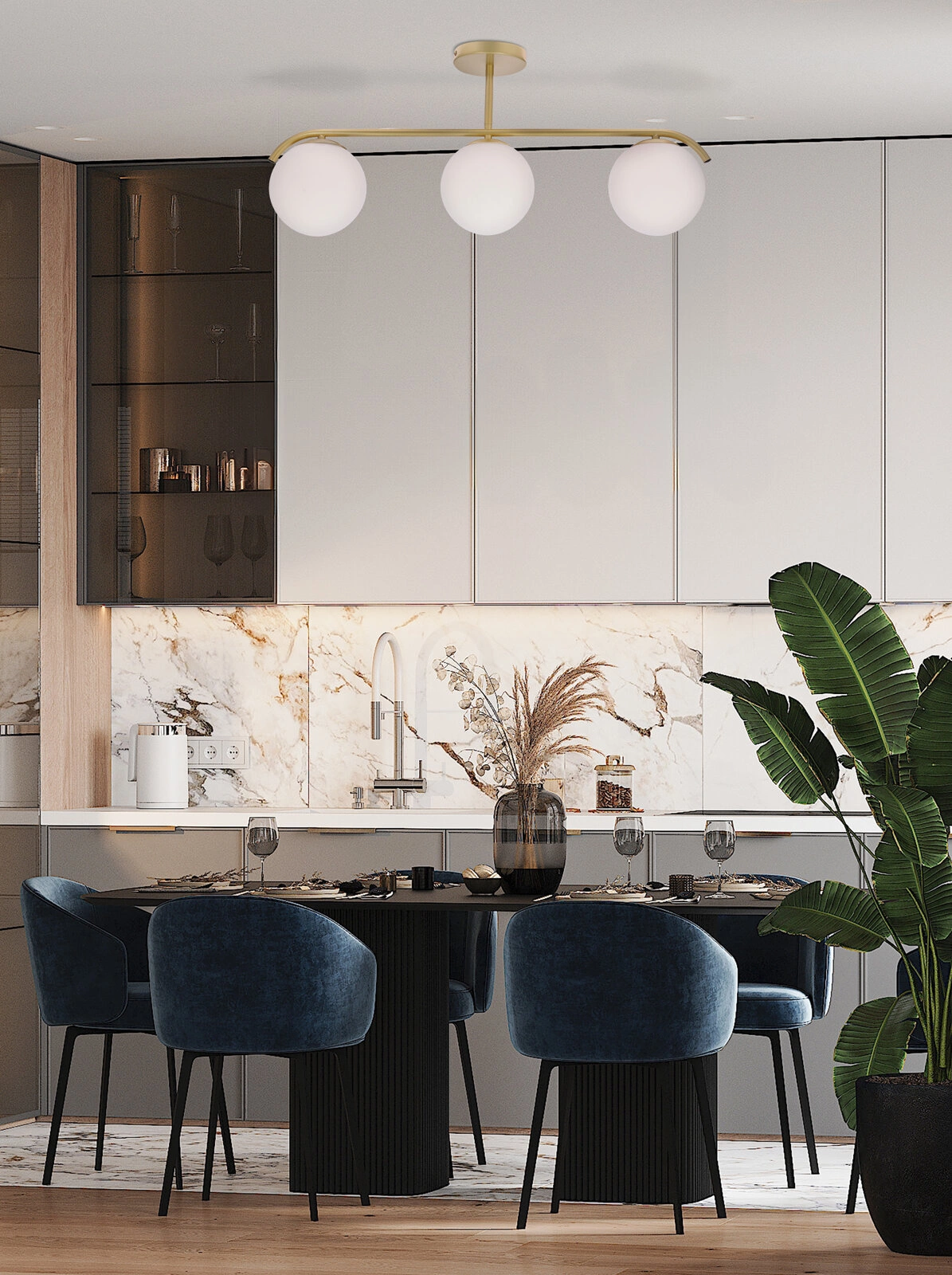 - Białe klosze i mosiężna oprawa tworzą elegancki kontrast, dodając charakteru każdemu pomieszczeniu
