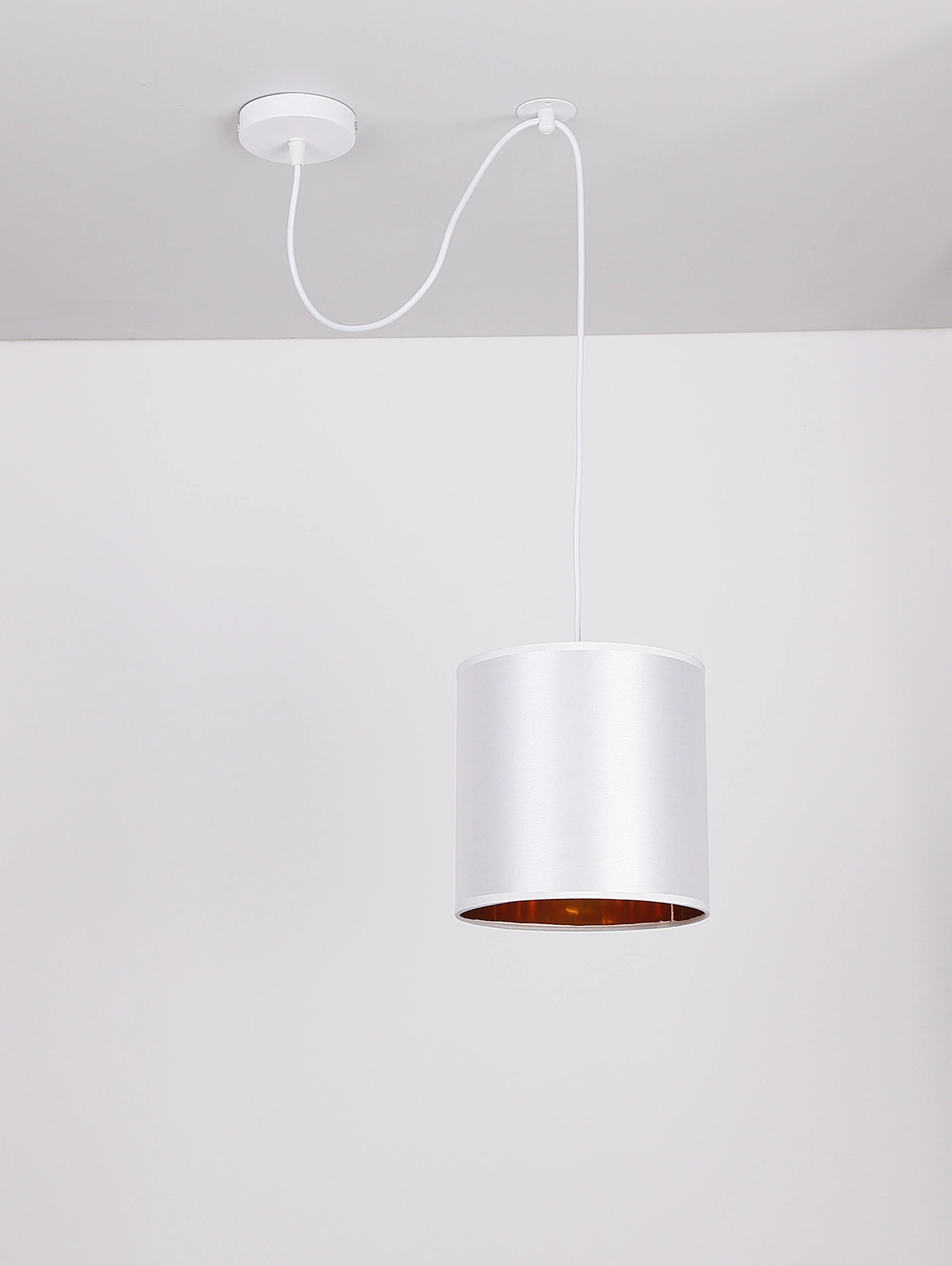 - Biały tkaninowy abażur – zapewnia miękkie, przyjemne światło i nowoczesny wygląd