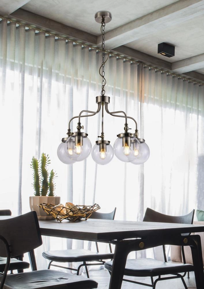 Lampa wisząca Ballet 5x40W E27 patynowy wykonana jest z wysokiej jakości materiałów, takich jak szkło i stal, co gwarantuje jej długą żywotność i odporność na uszkodzenia. Bezbarwne szklane klosze są odporne na zarysowania, a stalowa konstrukcja zapewnia stabilność i solidność lampy.
