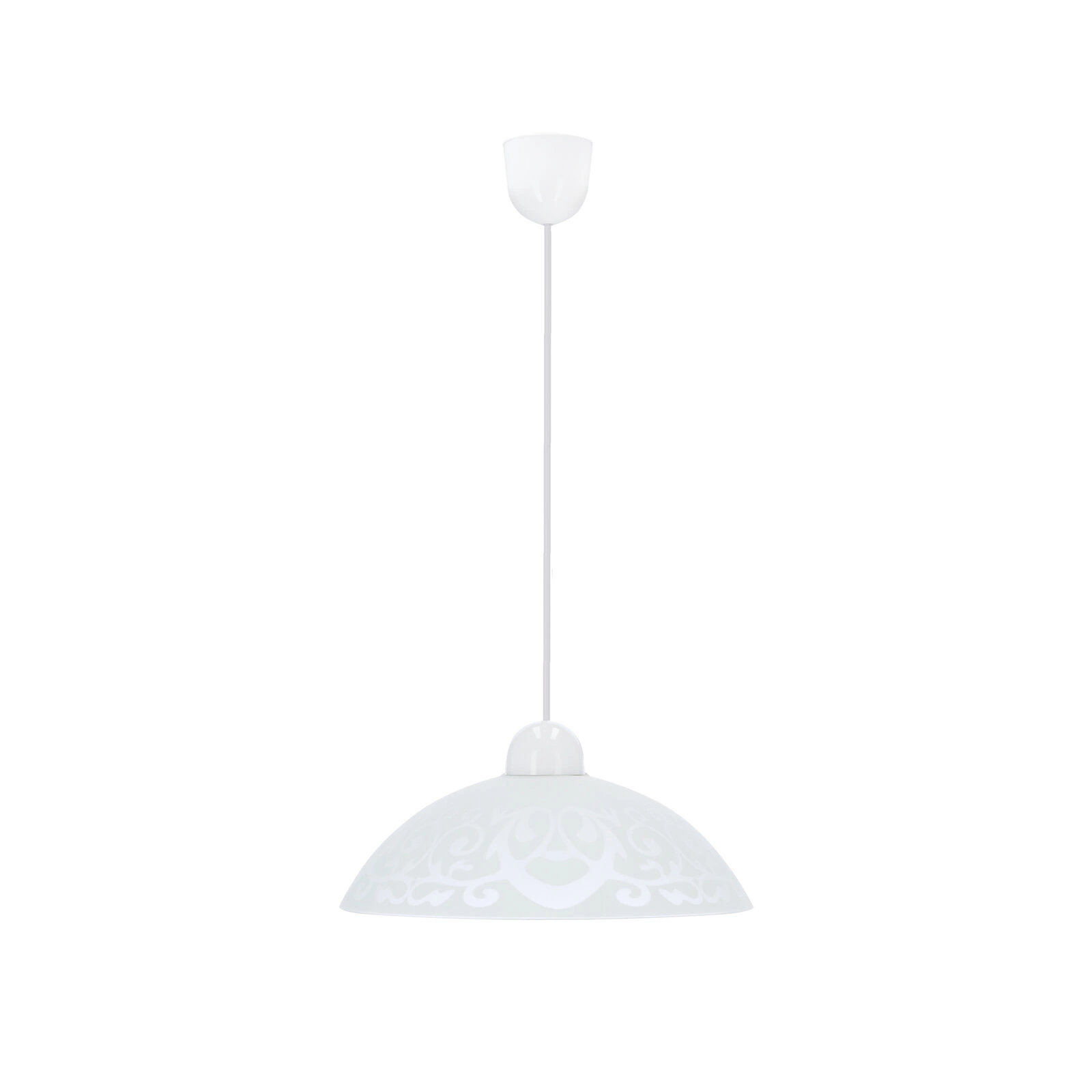 - Biały kolor lampy i jej klasyczny design z subtelnym wzorem na kloszu dodają elegancji i uroku każdemu pomieszczeniu.