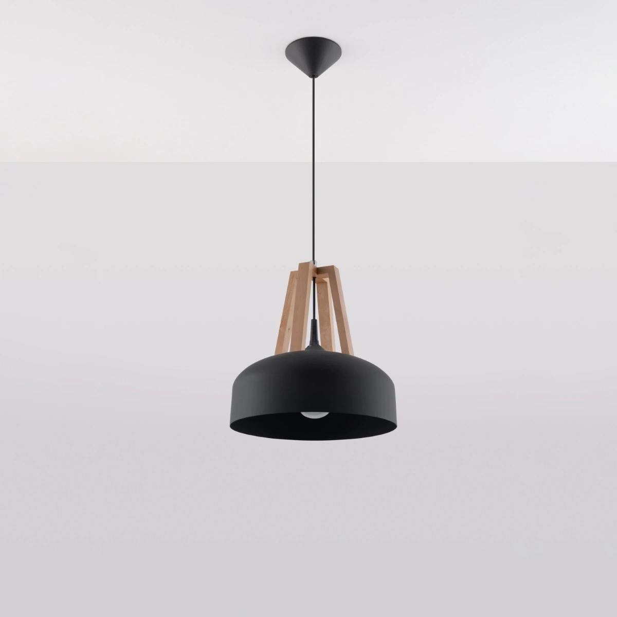 Nowoczesna lampa wisząca CASCO przyciąga wzrok nie tylko niebanalnym designem, ale także przemyślaną funkcjonalnością. Zestawienie czarnego metalu z naturalnym drewnem tworzy wyrazisty kontrast, który świetnie wpisuje się zarówno w surowe, industrialne aranżacje, jak i cieplejsze, skandynawskie przestrzenie. Prosty, geometryczny kształt klosza nadaje lampie lekkości, podkreślając modernistyczny charakter wnętrza.