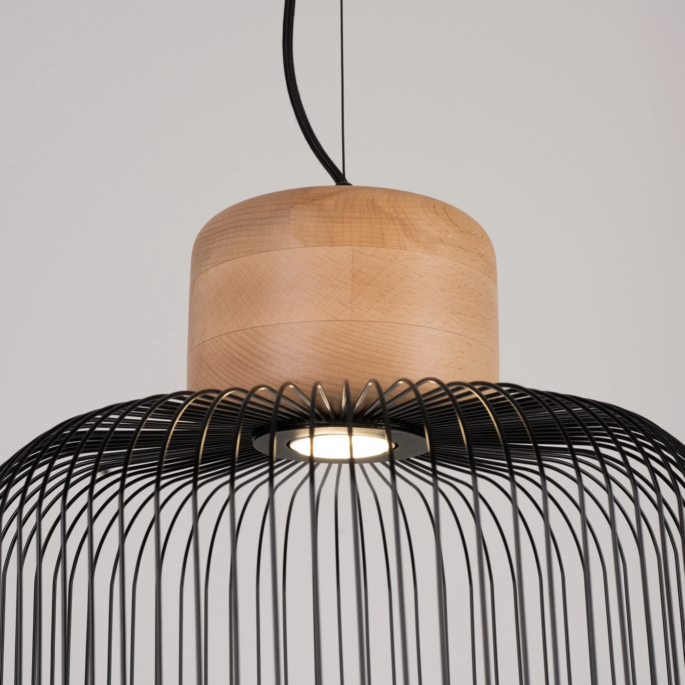 Gabbia 35 to lampa wisząca idealna dla miłośników surowego, loftowego klimatu. Czarne, ażurowe klosze wykonane ze stali tworzą interesującą grę światła i cieni, zapewniając przytulną atmosferę w każdym pomieszczeniu. Dzięki kontrastowi stalowych i dębowych elementów model ten doskonale prezentuje się nad stołem w jadalni, wyspą kuchenną czy w centralnym punkcie salonu, podkreślając indywidualny charakter przestrzeni.