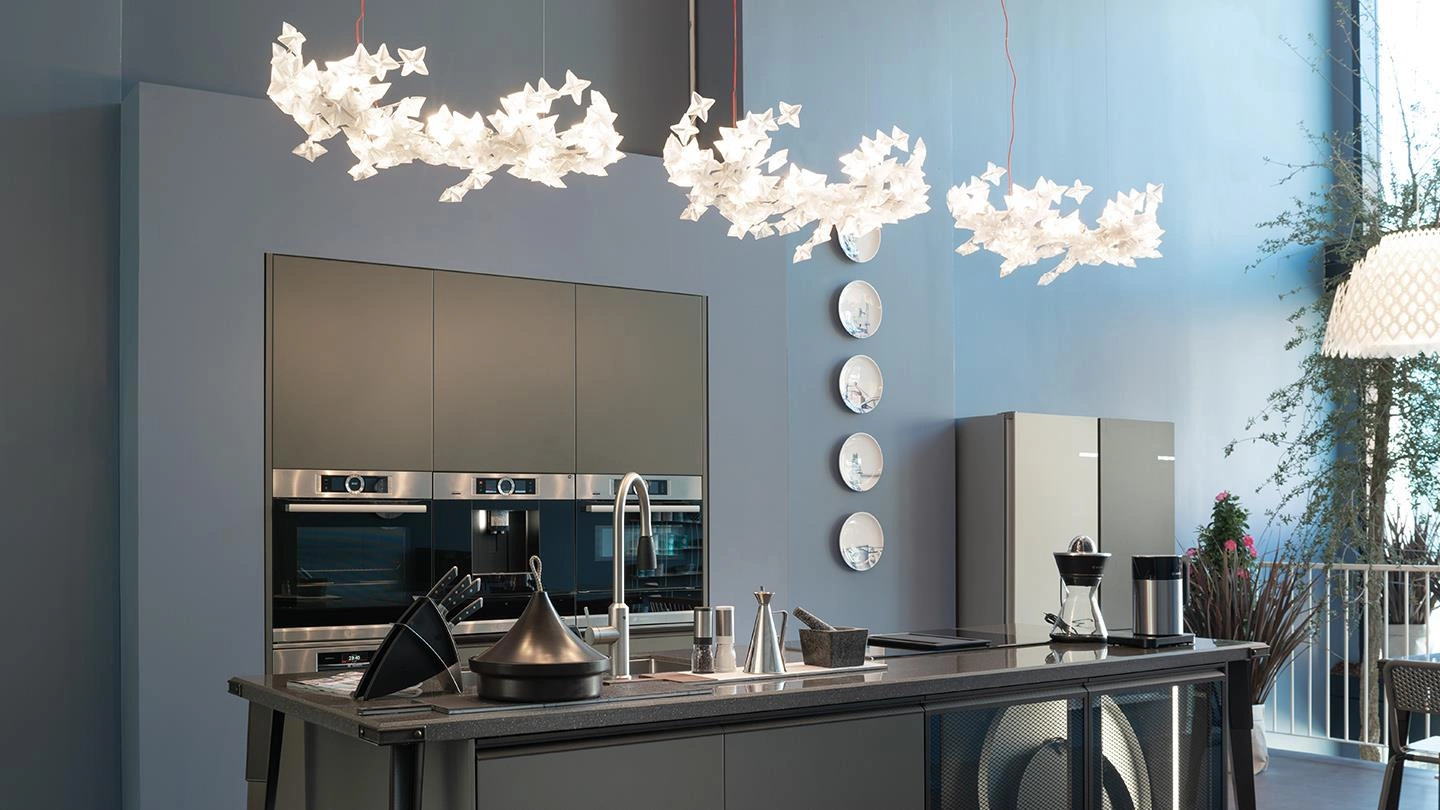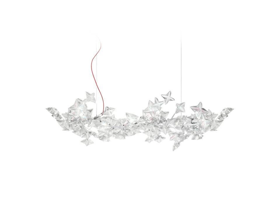 Dzięki wyjątkowym delikatnie kolorowym refleksom przezroczysta lampa wisząca Hanami L jest połączeniem piękna, wyrafinowania i elegancji. W tej niebanalnej lampie zastosowano Lentiflex® — materiał z diamentowymi refleksami, który został z wdziękiem ręcznie zmieniony w kwiaty umieszczone na ramie ze stali i poliwęglanu.