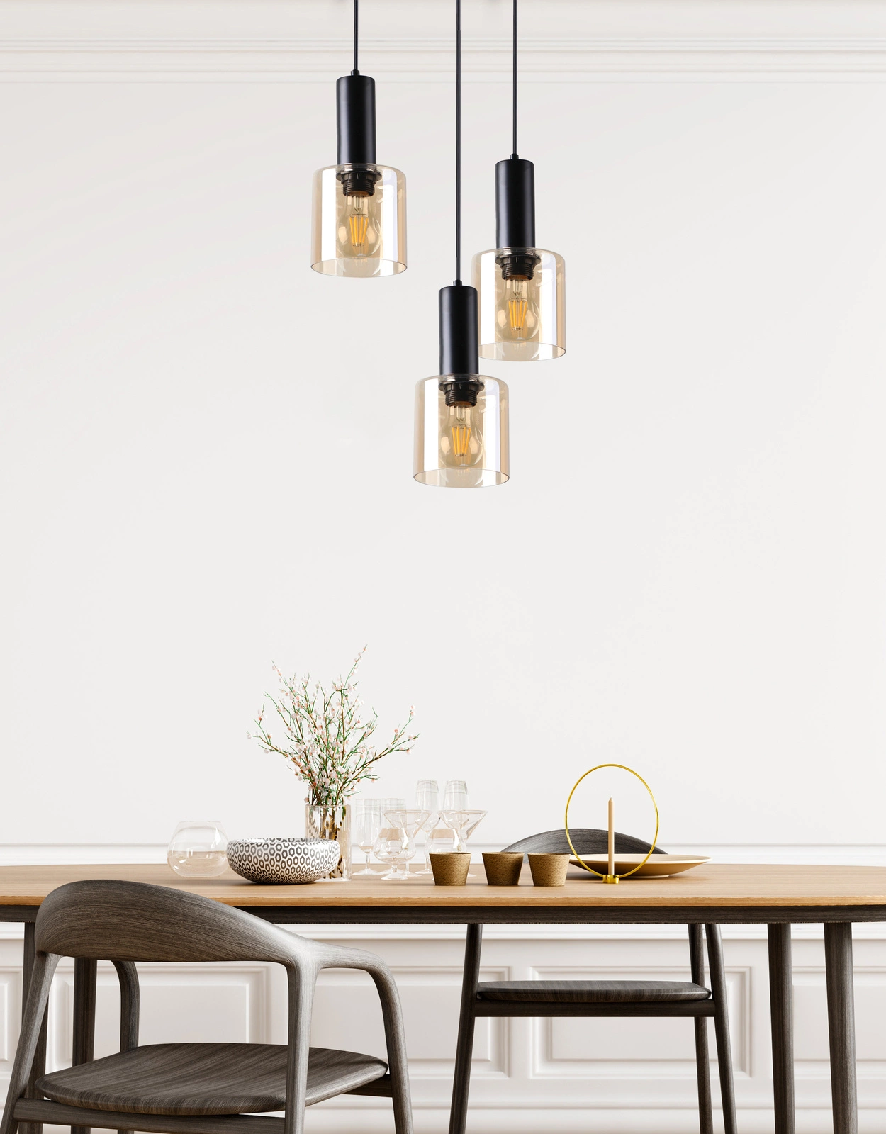 - Nowoczesny design z bursztynowymi kloszami – dodaje wnętrzu elegancji i ciepła