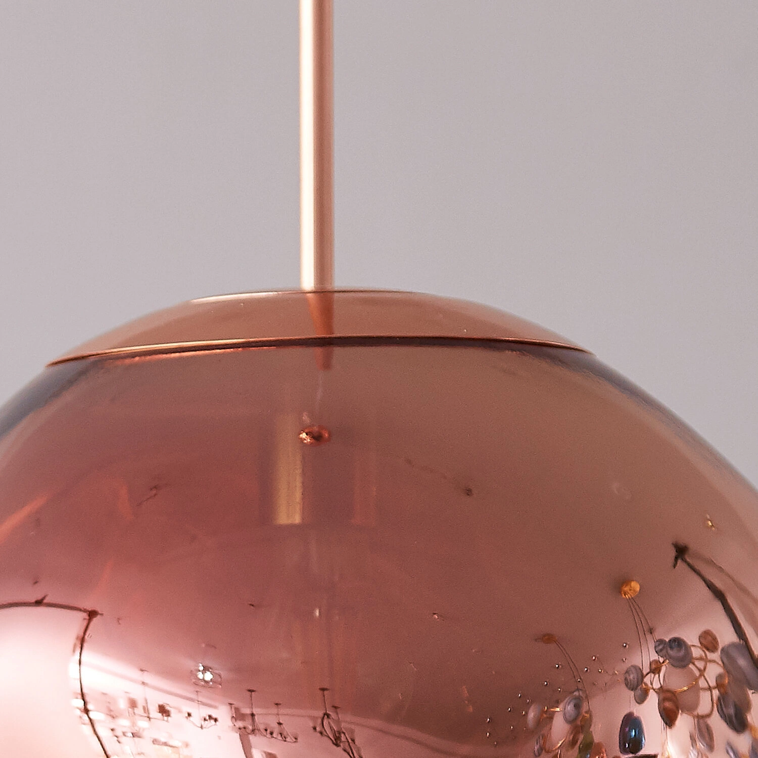 GLAM S 18 cm to lampa wisząca kula, która od pierwszego spojrzenia przykuwa uwagę swoim miedzianym, lustrzanym wykończeniem. Klosz o średnicy 18 cm prezentuje się niezwykle efektownie zarówno w świetle dziennym, jak i po zapaleniu żarówki, tworząc przyjemną grę światła i odbić. Taki żyrandol do salonu czy lampa do jadalni to nie tylko źródło światła, ale również element dekoracyjny, który wnosi do wnętrza nutę nowoczesnego glamour z industrialną nutą.